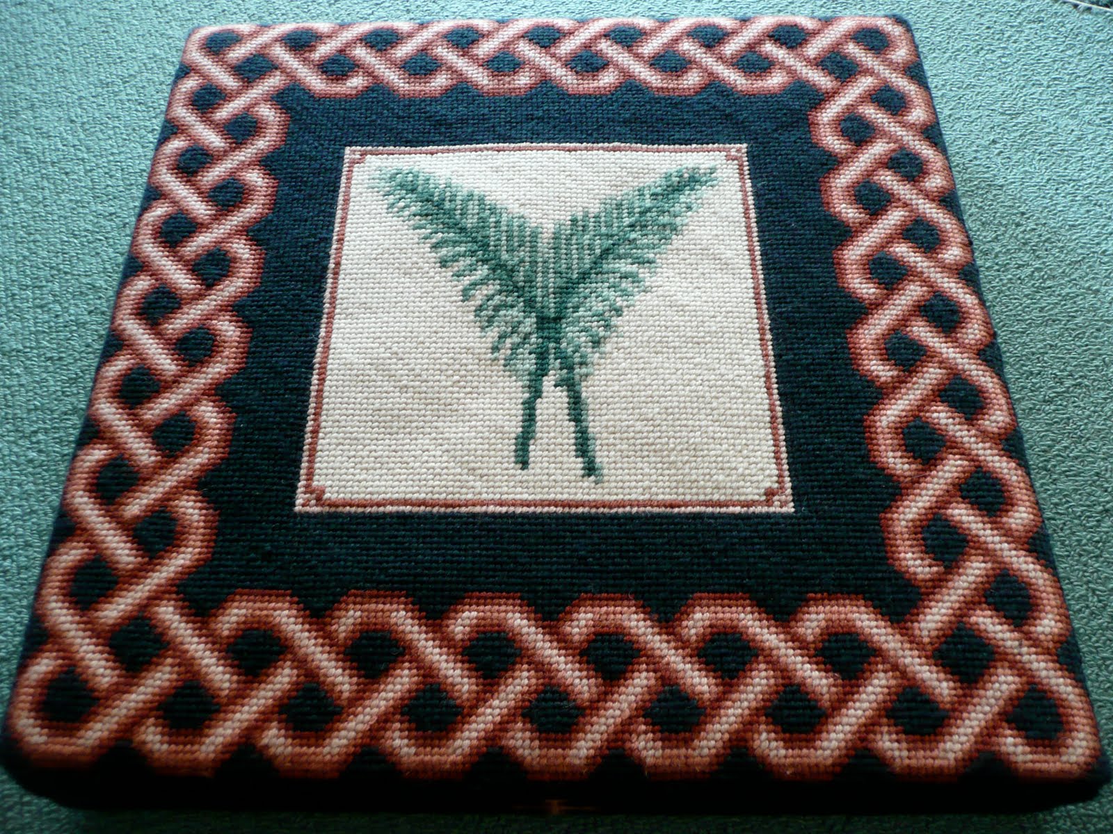 My daughter’s (now ex-)school has a wonderful tapestry cushion project going, whereby people can embroider a tapestry cushion to donate to the chapel on behalf of someone of their choice. Most people chose to donate on behalf of their daughters at the school, but I did one each for my two sons as well as this one for my daughter, for fairness as the boys’ school doesn’t do stuff like that. People’s cushions were sometimes a multi-generational affair, with grandmothers, mothers and daughters all contributing to the embroidery of their cushion. A number of different designs are available and the aim is for no two cushions to be alike but all matching with similar borders in a few colourways and for each design to have some biblical significance (they are chapel cushions after all). They are used in the chapel for special occasions, and there is a lovely book with photographs of each one and a brief summary of its maker/s as well as its dedicatee (not sure if that’s a word…)