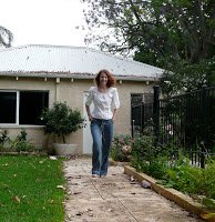 The top I’m wearing today is an oldie. It was made from quilting cotton with crocheted lace strips inserted in the front and back. I used this pattern New Look 6483, with a few variations obviously. In my usual fashion, once a basic pattern has proved itself in terms of fit I then feel compelled to improvise with each use. I was trying to copy a top seen in a Vogue magazine, for which I’ve just hunted unsuccessfully and I can’t remember the designer I’m afraid. My version has been a very useful top; reasonably pretty, loose enough for warm weather and very comfortable for casual days.