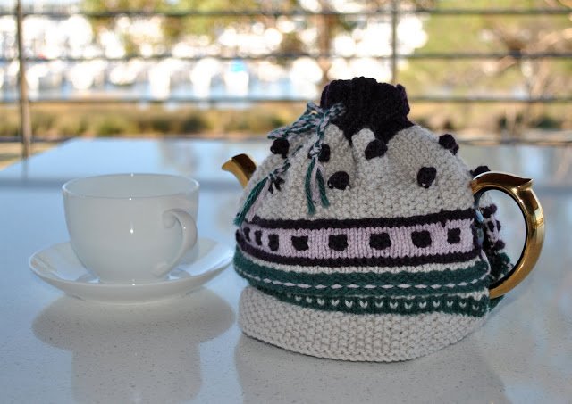 This is the tea cosy I knitted for my friend A for her birthday. It’s actually the very first tea cosy I made out of all of them and I love its little bobbles. It’s made from Jo Sharp wool; and from memory. I saw an example very like this one in a Jo Sharp knitting book and made this cosy pretty much from what I could remember of it. On a side note here, something that really bugs me is how yarn manufacturers bring out these veeeery expensive pattern books for sale which usually, often, contain about fifteen or twenty patterns. How ridiculous is that? You might only want to make one, or possibly two of the patterns in the book (how much knitting is the average person capable of, really), and you have to pay $50 for a whole bunch of patterns you’re not even remotely interested in. It would be so much more sensible if the patterns could be available singly, on a pamphlet and you could then just purchase the ones you want. That’s my opinion, anyway. What do others think?