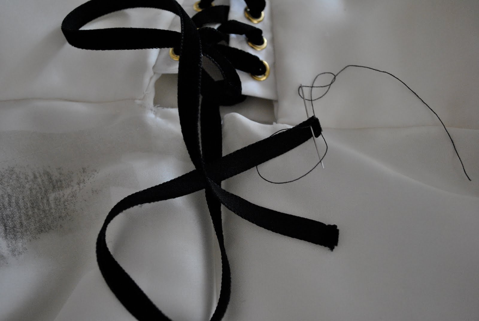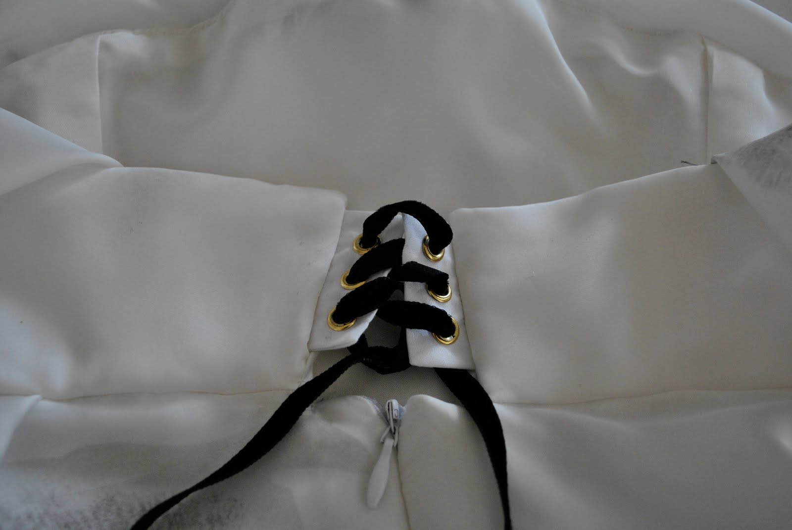 I had bought some white velvet ribbon to tie the corset closed but upon putting it in and trying the dress on with it I realised it was just too white. You know, like bright bright almost blue white that did not sit well with the softer creamy white that is the backdrop of the overdress… not all whites are created equal, as I should well know being an avid buyer of white fabrics and garments my whole life. Sometimes slight differences don’t matter; this time it did. Trust me. So I had to fit in a trip to Spotlight to get some black velvet ribbon. As a side note, whilst I was in Spotlight I was also waylaid by some un-walk-away-from-able fabric, and somehow I also have 2m of pale grey wool flannel, 1m of khaki grosgrain ribbon and 2m of slightly stretchy black denim newly in my possession… (shamefaced, I think I need help…)
