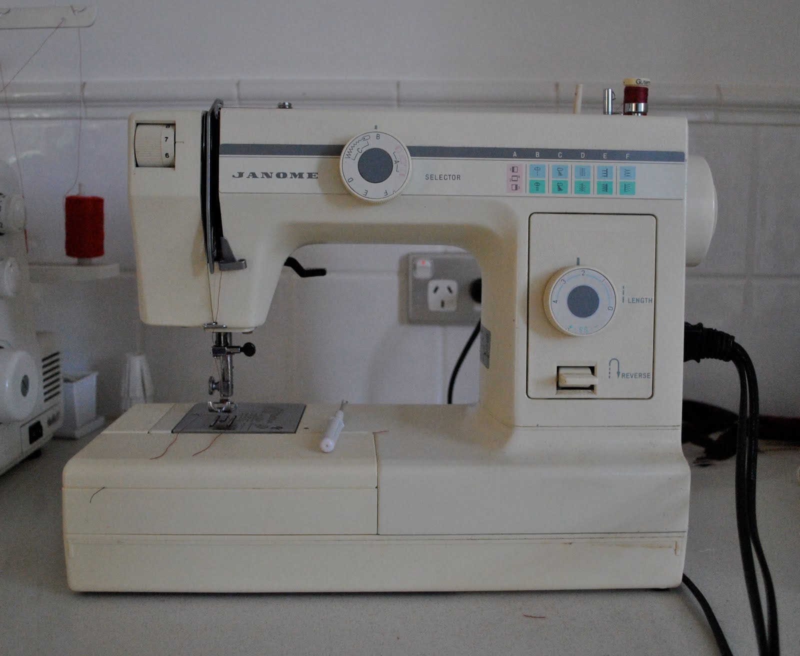 Firstly, my ordinary machine. I’ve had this little beauty for about twenty years now and it’s been wonderful all this time. It’s a very basic Janome machine, that is capable of forward stitching and zig-zag and has a reverse toggle. Yup, that’s about it!! Of course it does buttonholes too, but that is just a manipulation of the zig-zag stitch…. It also has six fancy stitches, which are on the far right of the green and blue labels on the top right. I’ve used these stitches only once or twice in the whole time I’ve had it. I’ve done all my adult sewing on this machine. I really like it because, being so basic, I can service it myself, and have managed to carry out a few minor repairs once in a while too. The most complex thing I’ve done is change its drive belt. It has no computer and so no fancy automatic functions, but this suits me to a T. My mother has a wonderful computer driven machine, and the one time I used it it’s automatic “needle up”/”needle down” function both startled me every time it did it, and frustrated me too. Plus, she always seems to be having to take it in to get “looked at”. because some timing thing is out or some such trivial disfunction, which renders it unusable. So annoying. This would drive me round the bend if it was my machine.