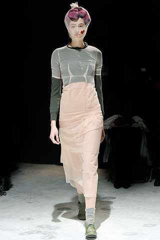 There were also some interesting light grey wool dresses with overlays of apricot pink chiffon, like the lining was on the outside of the dress. Formfitting, straight skirts below the knee; quite dreamy and pretty and so interesting (at right, Comme des Garcons, Fall 2009, from www.style.com).