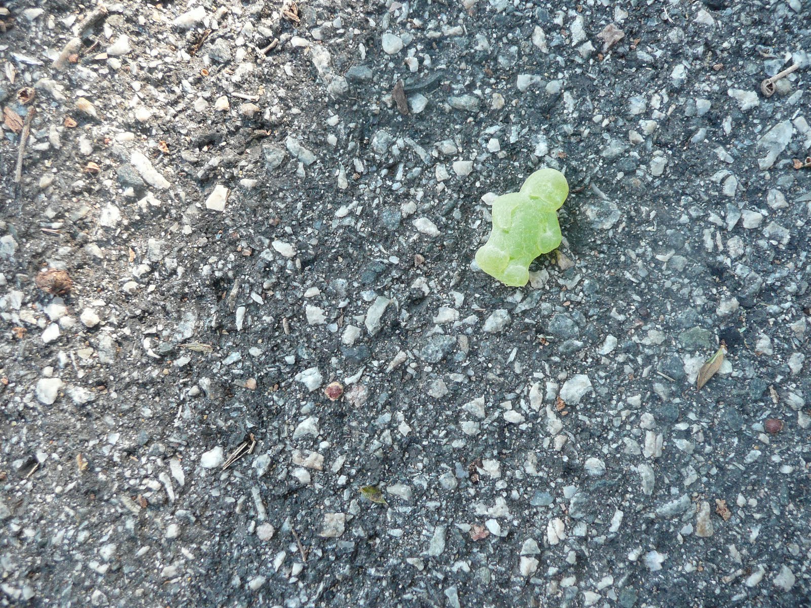 Today’s random picture below; little abandoned green jelly man, seen on my walk this morning