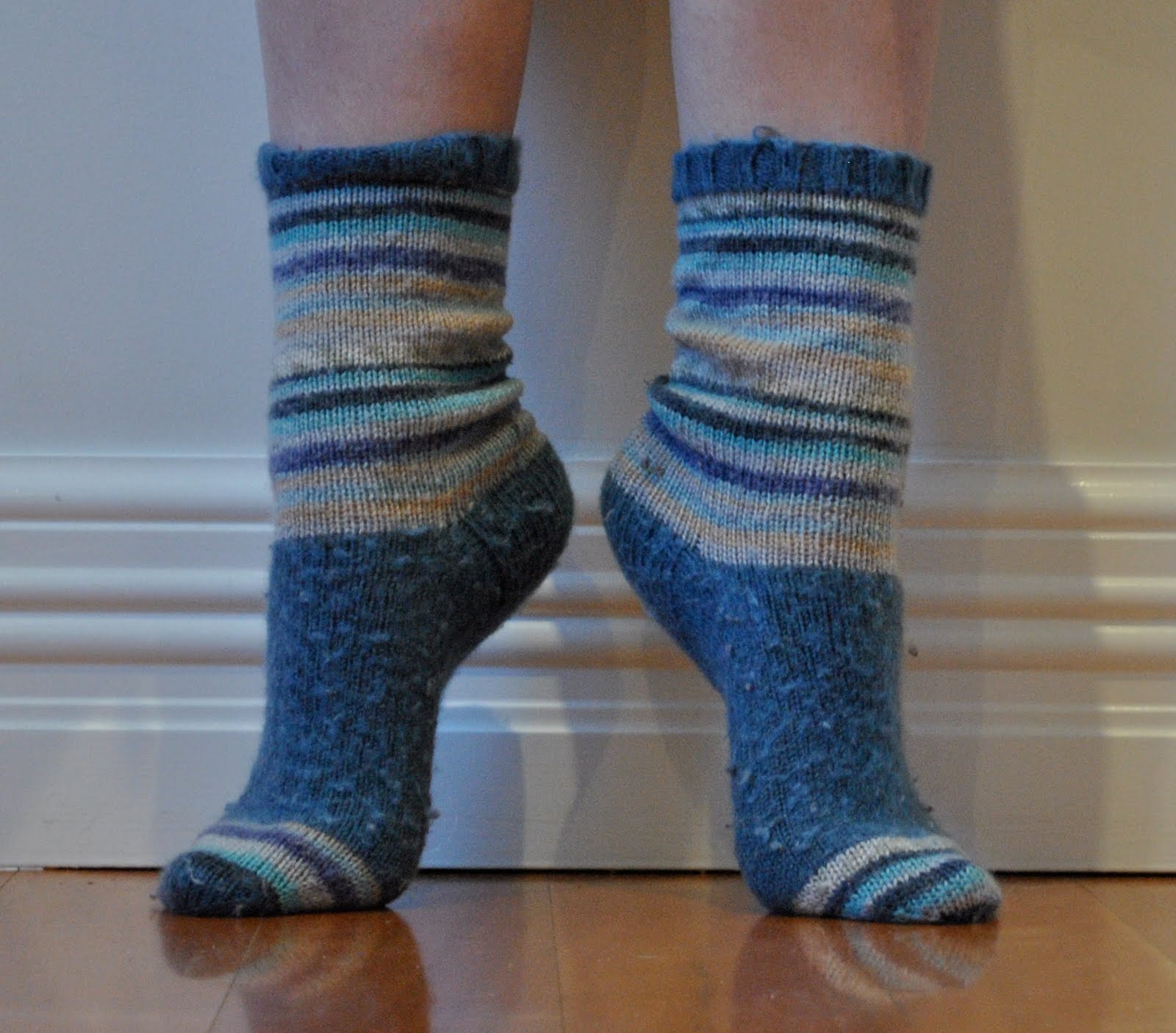 This is another pair of socks made from leftover wool (the stripe) and the plain blue Patonyle sock wool I bought to help eke out the leftovers… these socks have shrunk to the extent that only my daughter can wear them.  I’m just relieved she likes them; she says they’re nice and warm.  It’s hard to believe they once fitted my feet!!