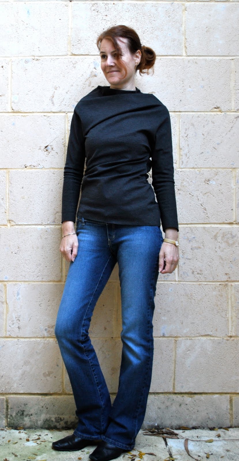 The second version, that I am wearing today, is out of a lovely thick warm charcoal marle knit. I widened the sleeves by about 1.5cm and they are much more comfortable… Because the fabric is a little thicker the twists don’t show up as dramatically on the body of the top, but with the weather as cold as it is in Perth right now that extra fabric thickness is very welcome! I think it might have been about 3C this morning when I was taking these photos here, brrrr!