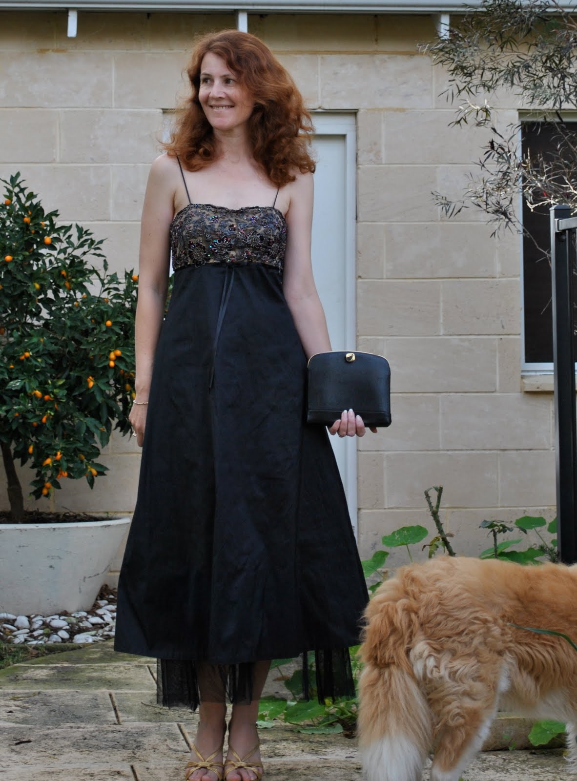 This is not a new dress (although I have finished my new evening dress and will show it here soon!) This is an old dress I made about three years ago, out of lovely matte stiff silk taffeta for the overskirt, very fine black tulle for the underskirt; and the bodice is gold satin with a beautiful beaded, embroidered and sequinned black tulle fabric overlay. There is black satin ribbon sewed as a decorative detail under the bodice and tied in a little bow, and I also added thin black satin ribbon shoulder straps. The beaded fabric was very expensive, about $80/metre from memory, so I only bought about 40cm, just enough for the width of the bodice! There were still some scraps, and the beaded tulle was decorated a little sparse IMO, so I cut out quite a few of the beaded/embroidered motifs from the leftovers and hand-sewed them onto the bodice after it was finished to fill in the gaps and make for a super-luxurious, fully sparkly bodice! The pattern I used was Burda 8046. I haven’t checked if this pattern is still available, but I’ll review it anyway…