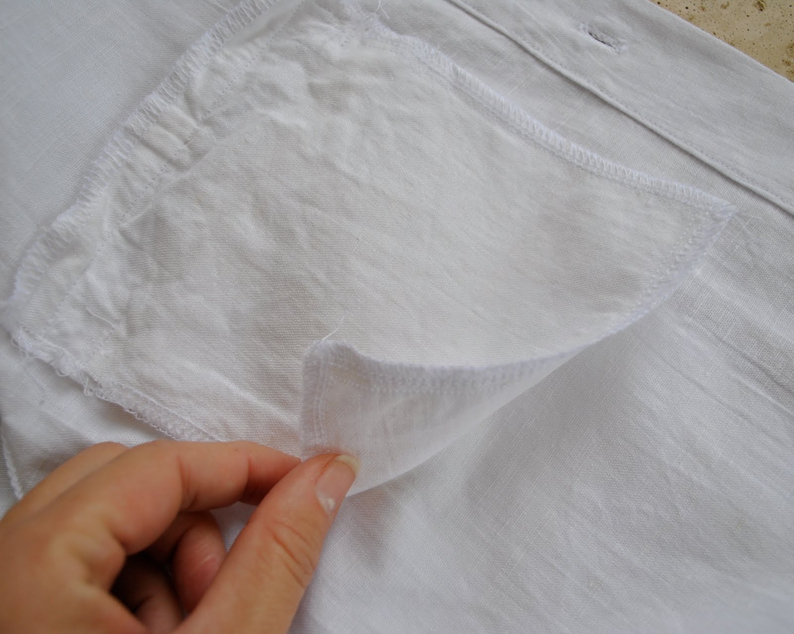 The design variations this time are in the collar, there isn’t one!! And in the pocket. I made a double welt pocket with a loop button closure. I included a picture of the inside to prove that it is indeed a working pocket! A clothing feature that I loathe is “fake” pocket designs, such as a welt pocket that isn’t actually a pocket at all, but a decorative detail; massive pet hate.