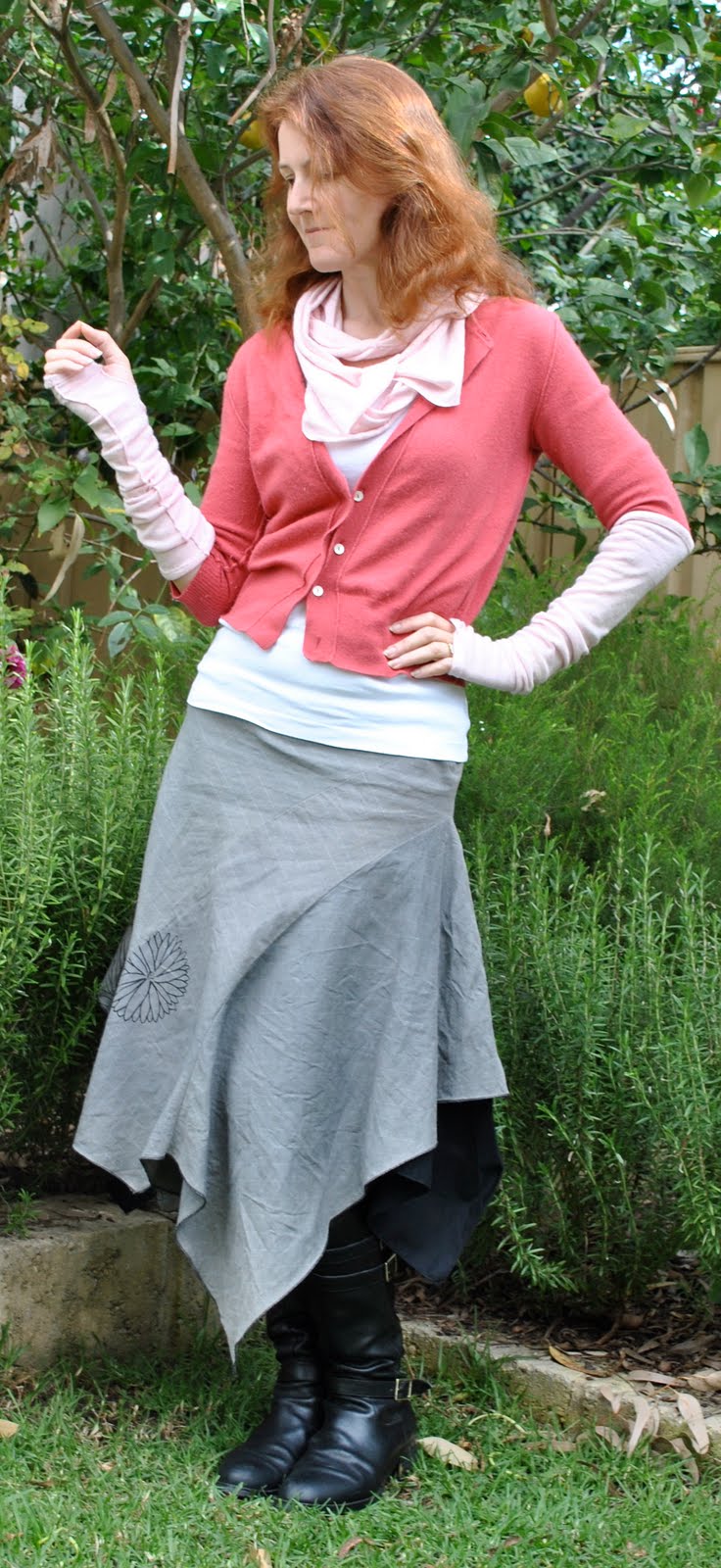 This pure wool top is a pretty shade of pink but had developed some nasty big holes over summer storage. I continued to wear it as a thermal for a while, with its pink edges peeping out and adding a layer of colour to other ensembles but then as the holes got awfully big I sadly accepted it was too raggedy and resigned it to the re-fashioning bag … (you can see one BIG hole centre front lower edge, but trust me, there’s about four other littler ones lurking about there too…)
