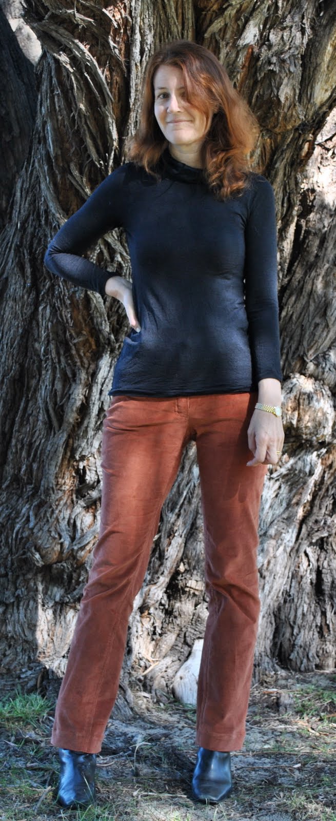 I’ve made myself some new jeans, but (warning, lack of elegance alert) they’re not very exciting. They are corduroy, and I do love corduroy jeans. They are so warm and comfy during winter. But I’m first to admit corduroy is a very casual fabric and sadly not considered in the same class as denim jeans. These are my equivalent of trackydacks. The purpose of my new jeans is just for casual warmth, for when I’m on my bike or the beach, or if on a cold evening I just want to slip something warm on to curl up on the couch and drink tea and knit in front of the TV, so don’t peer too close or expect any chic fabulousness here…hehe.