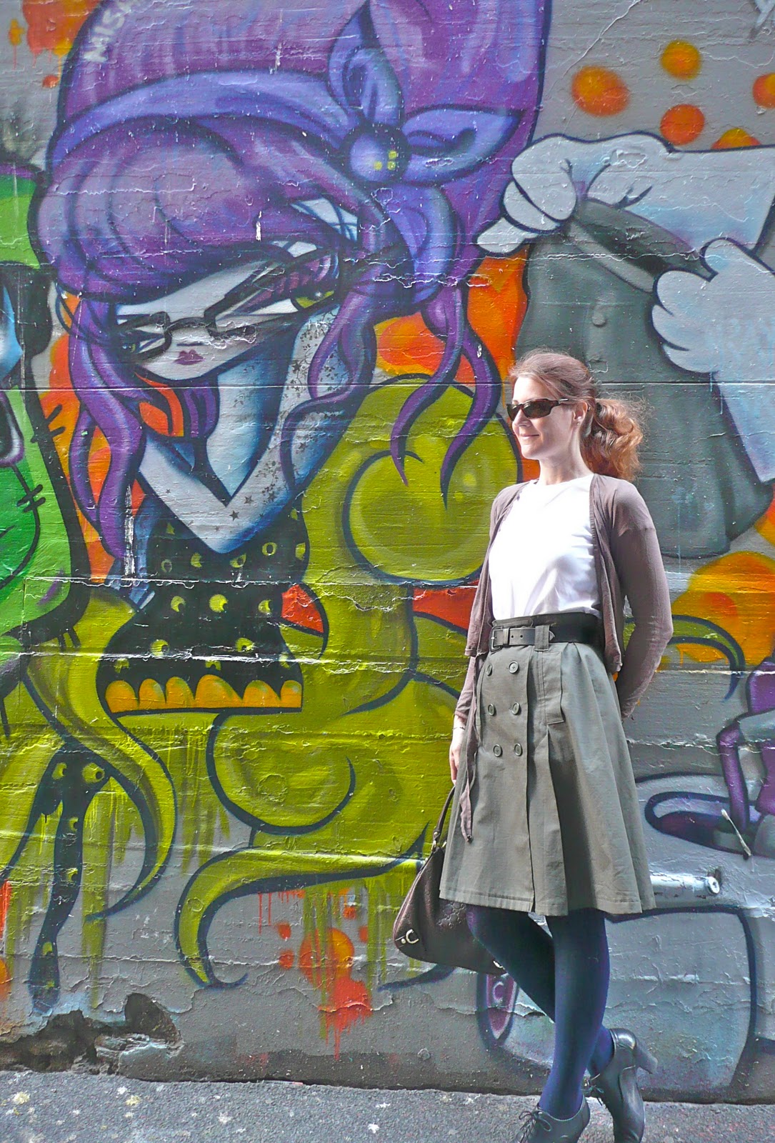 I love the graffiti laneways in melbourne. I recently picked out the skirt you are wearing to trace and make up. And as usual, I love your shoes!