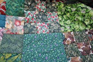 This is a quilt I made a few years ago.  The fabrics are all green based, and all “floral” in the sense they all are leafy, fruity, and/or vegetable-y  (I do like to make up words when I feel like it)  I collected fabrics over about six months until I had found enough to satisfy my criteria, in both the quantity and in the prints.  There was almost NO leftovers when I had finished, making the quilt “green” in a colloquial sense too…  That’s the beauty of quilts based upon basic square shapes, you can plan them to be very economical with fabric.