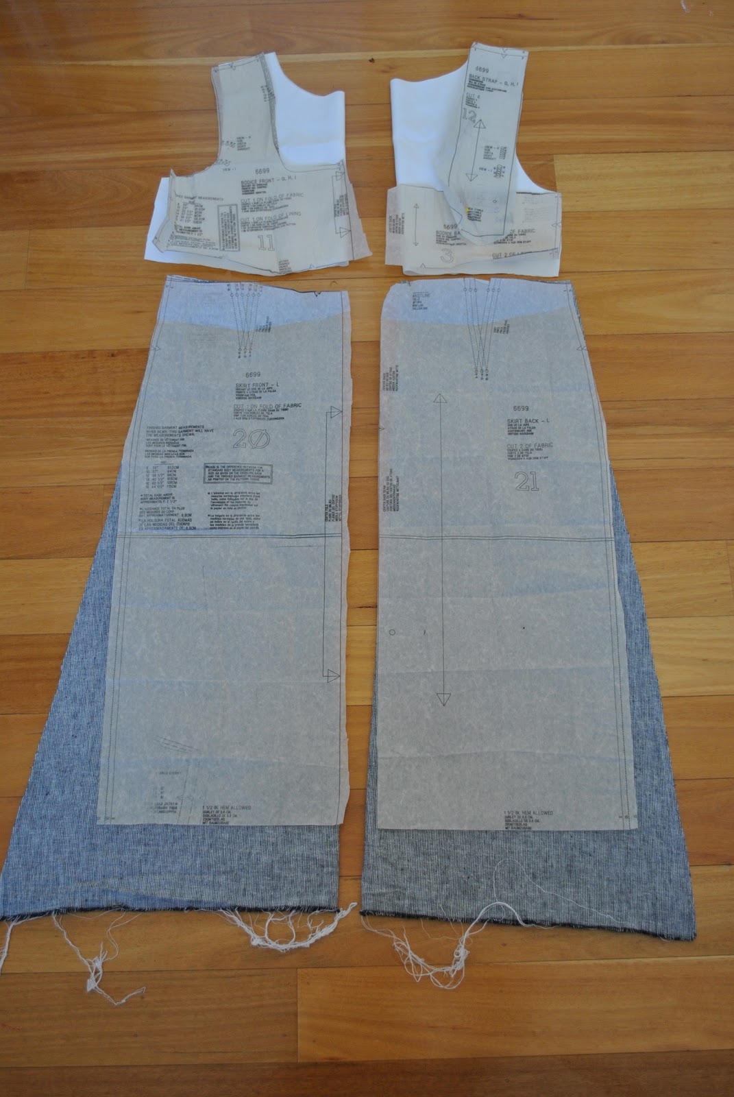 The pattern; I’ve used this New Look 6699 pattern quite a lot, and made just a few adjustments to get the look and silhouette I wanted for this dress; demonstrated in the pictures below. Firstly, the zip has been inserted in the left side seam rather than the centre back. This allowed me to eliminate the whole centre back seam and the back pieces are cut as one piece each (see below left, these pieces are all cut on the fold). Not having a centre back seam enables the details of the beautifully worked lace to stand out and shine, uninterrupted by a distracting cut-and-join right in the middle.