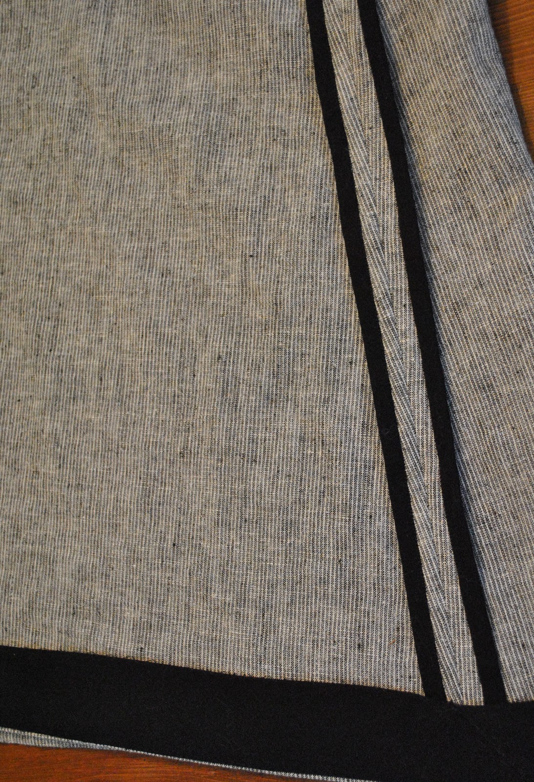 The fabric; the bodice is slippery-dippery ivory silk crepe and faced in the same fabric; the skirt is a divine-to-work-with nubbly linen/cotton mix, with woven pinstripes in charcoal and ivory. The skirt is unlined as I want it to be cool in summer, and anyhow I felt it unnecessary to line this one. Just a dressmaker’s instinct.