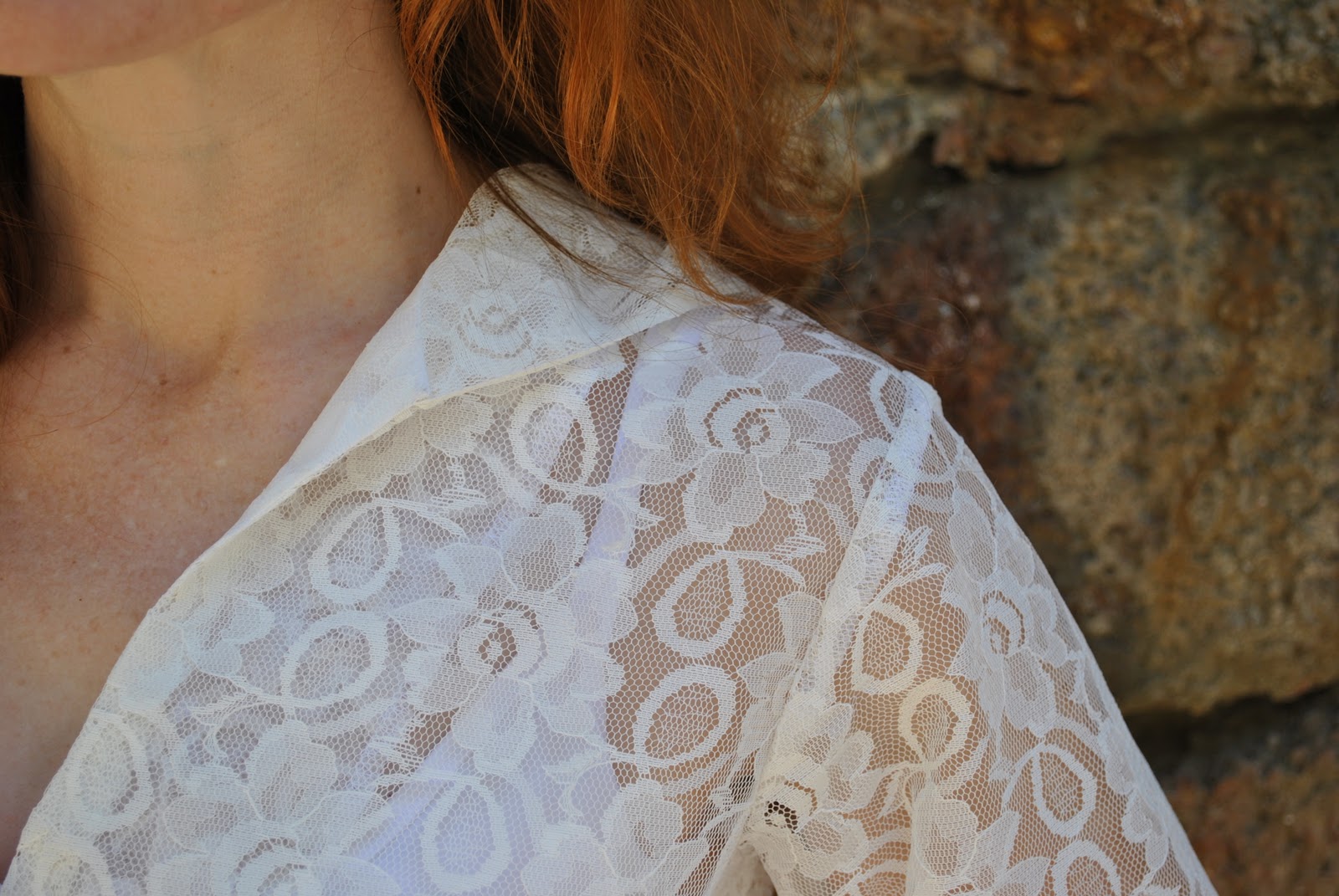 Top; Butterick 4985 with different sleeves and a lace collar, seen first here, grey printed and pre-shirred chiffon
