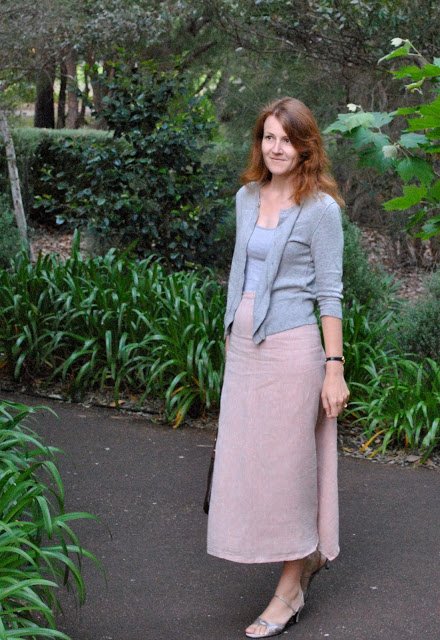 So today I’m trialling a new way of wearing this skirt, and I have to say I think this one is my favourite… I did like it how I wore it previously with the flappy bit over the hip and wore it that way first since that is how it was modelled in the book Unique Clothes Any Way You Like, by Natsuno Hirawai and I also thought this way was interesting.  But when the zip closure is swivelled around to the back, the front of the skirt takes on an appearance of monastic simplicity, a smooth sheath uninterrupted by darts, gathers or any other fabric manipulations to mar the smooth fall of cloth…  and from the back is this sort of droopy bustle which I think makes quite an interesting rear view, no?