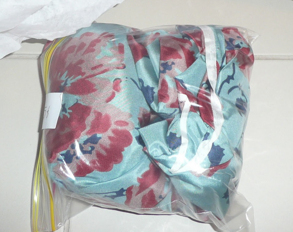 As for the sandwich bag…I always cringe in the thrift shops when I find something that is made in a fine fabric and the clerk just stuffs it in a bag. I immediately unsack it and lay it out across the backseat of my vehicle so the poor item can breathe.
