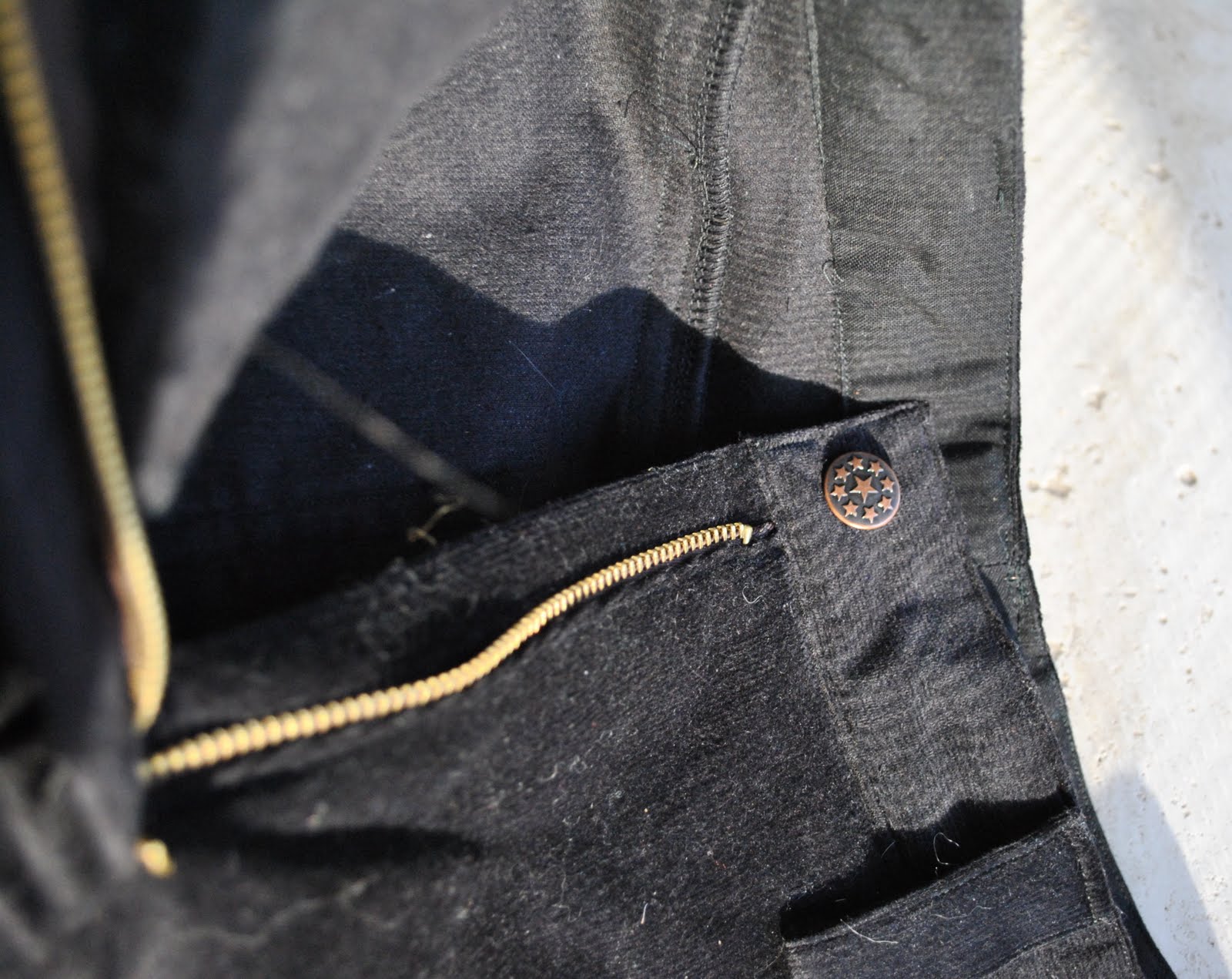 This time, I graduated the lower leg section; from a fitted-to-the-pattern knee and then out to the ankle by about 6-7cm on each side seam overall. I did my usual centre back pinch-in for a sway back adjustment (illustrated here). The only other alteration to the pattern was to add a zip placket; an absolute essential feature in any pair of jeans which is inexplicably absent from this pattern.