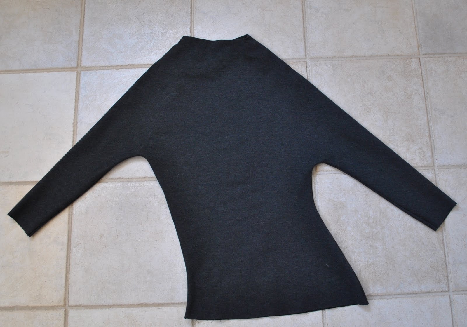 I’m sure you are wondering what this intriguingly sculptural one-pattern-piece top looks like when it is laid flat… no? Well, since I have just brought it up and no doubt piqued your curiosity, I shall now proceed to satisfy it… kind of me, no? Below is my older, but the same pattern, charcoal top, now washed and worn for about a year now so maybe has got a tiny tad mis-shapen over the last year, but you get the idea…. When it is on those skewiff details pull the top in to hug one’s body beautifully and make for a very flattering silhouette. The cream jersey I have used to make this new version is quite a bit stiffer than the charcoal, and has less stretch, so getting it on is kind of a struggle. But once it is on it feels great! I do love a firm snug top, especially in the winter time.