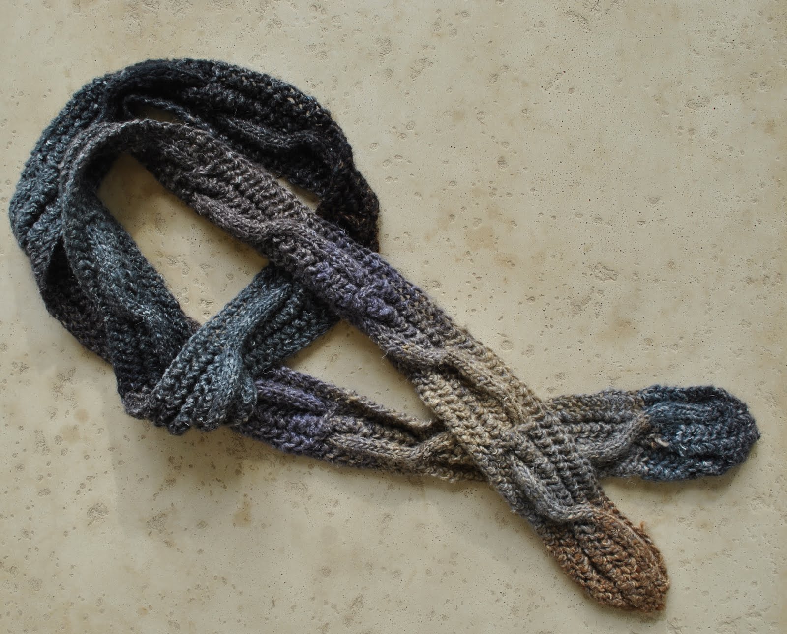 A meandering cable….I love how you describe this scarf. It looks good too. And I like the tree in the background of your photo.
