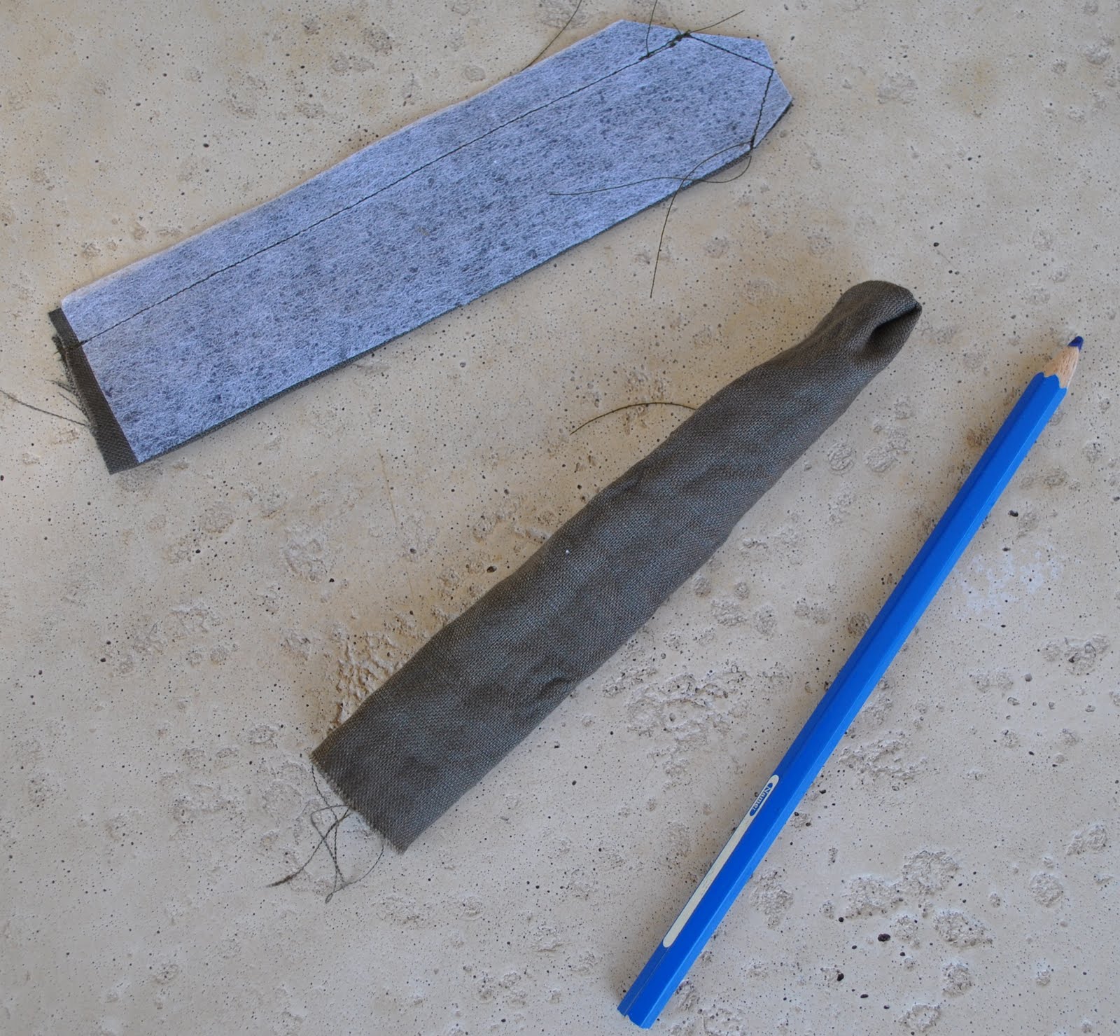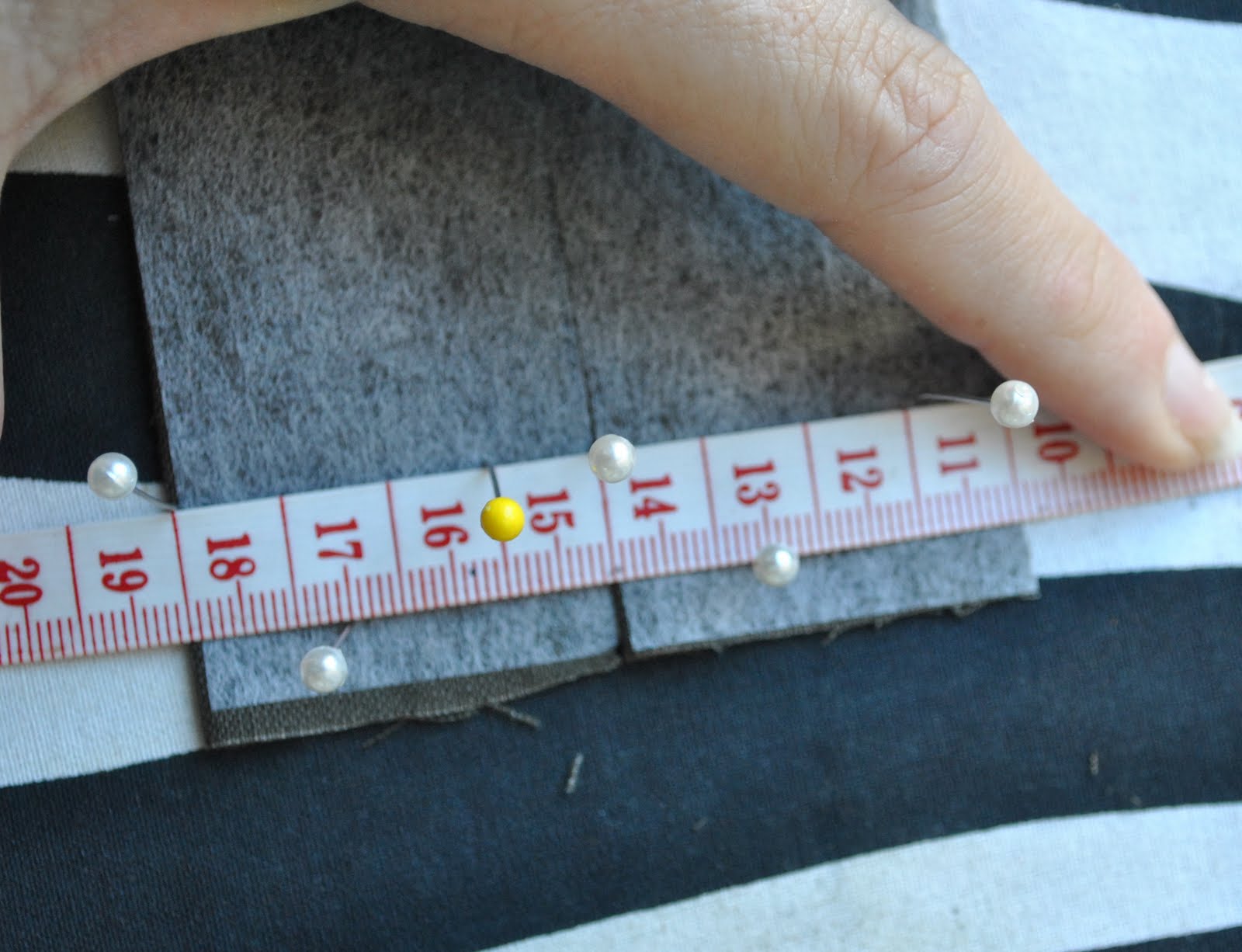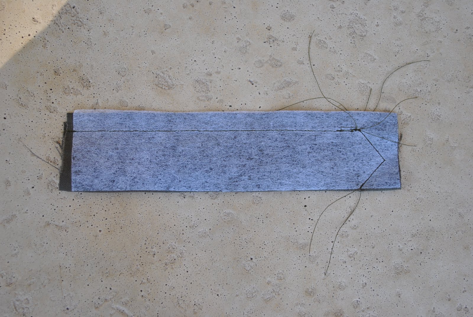 In my lazy and/or more hurried projects I have been known to wing the arrowhead tabs and hope for the best, but obviously the best results are gained from careful measurement. Cut both tabs together to ensure they are identical in size, and apply interfacing. (Later edit: In this case, I have folded the tabs right sides together, and the fold forms one of the long sides of the tab.) Then measure and mark out the arrowhead part as exactly as possible with pins…