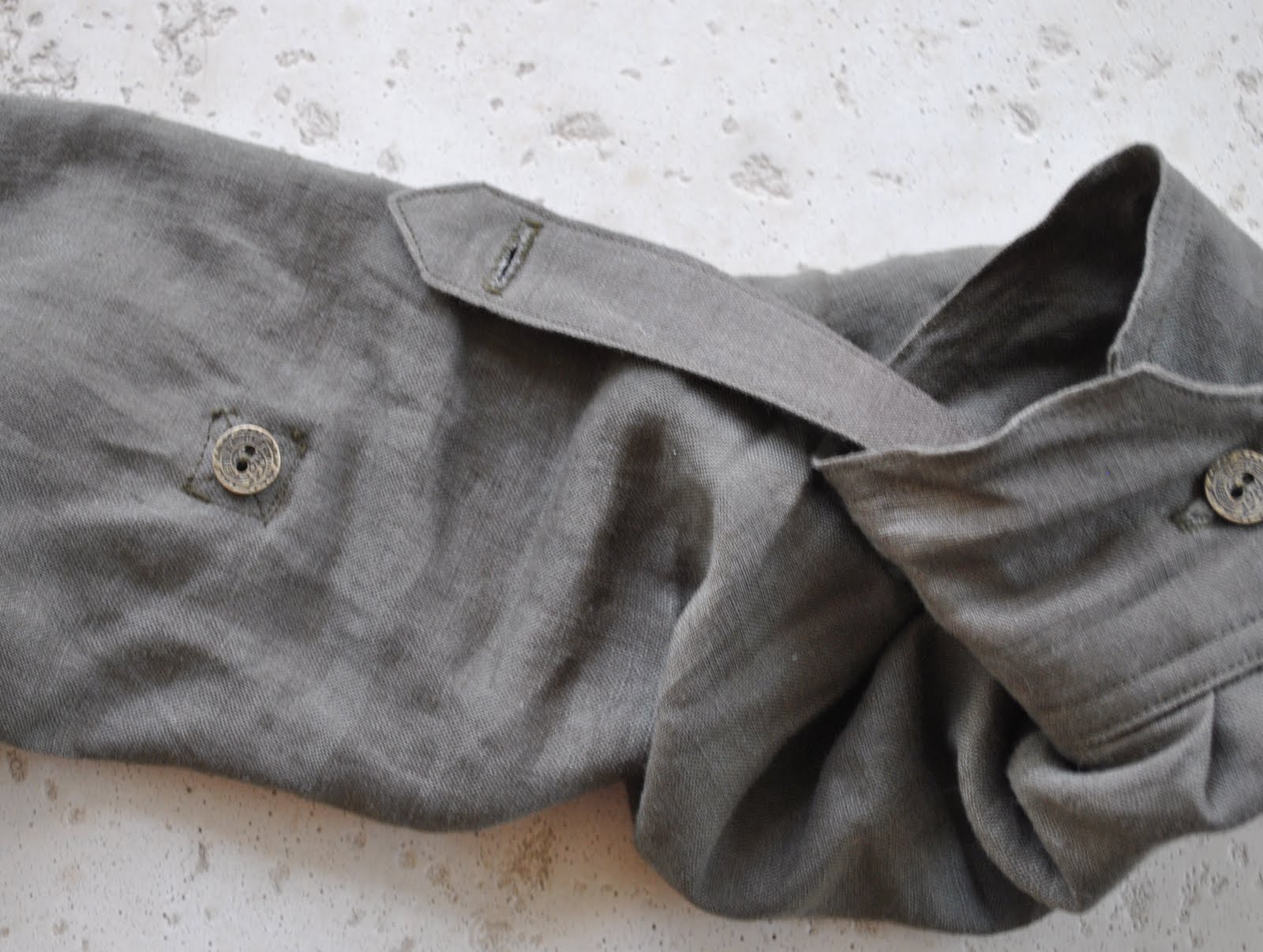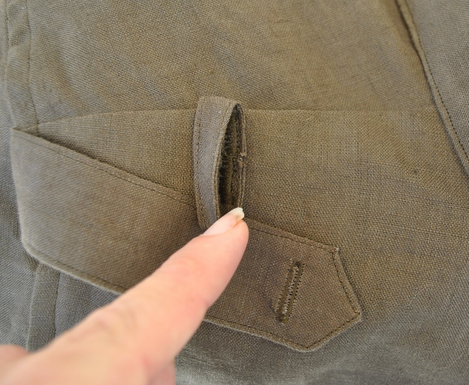 On my army shirt I added a decorative strip to hold down the shoulder tabs, this was just zig-zagged firmly into position on the double thickness yoke area. If your shirt pattern has only a single yoke piece you will need to reinforce this area underneath with a little strip of bias cut fabric; and also for the tab’s button when you sew it on. In fact, if your pattern only stipulates a single thickness of fabric for the yoke I recommend you cut out two and sew them on together for more stability; as this area is subject to a lot of fabric strain in a man’s shirt.