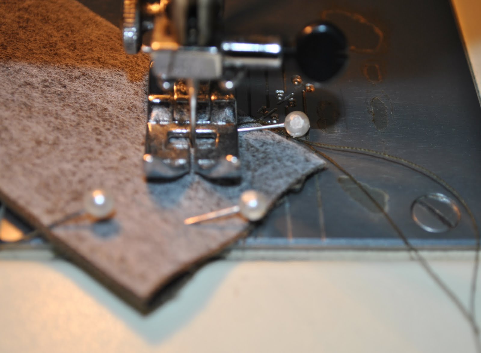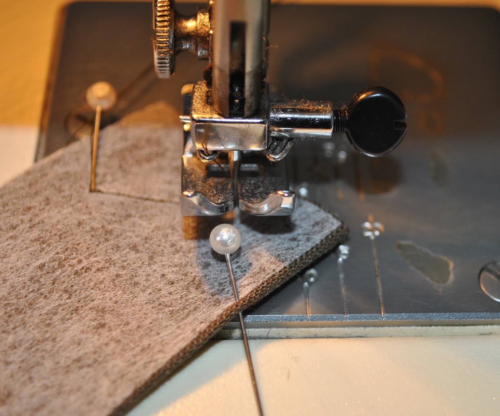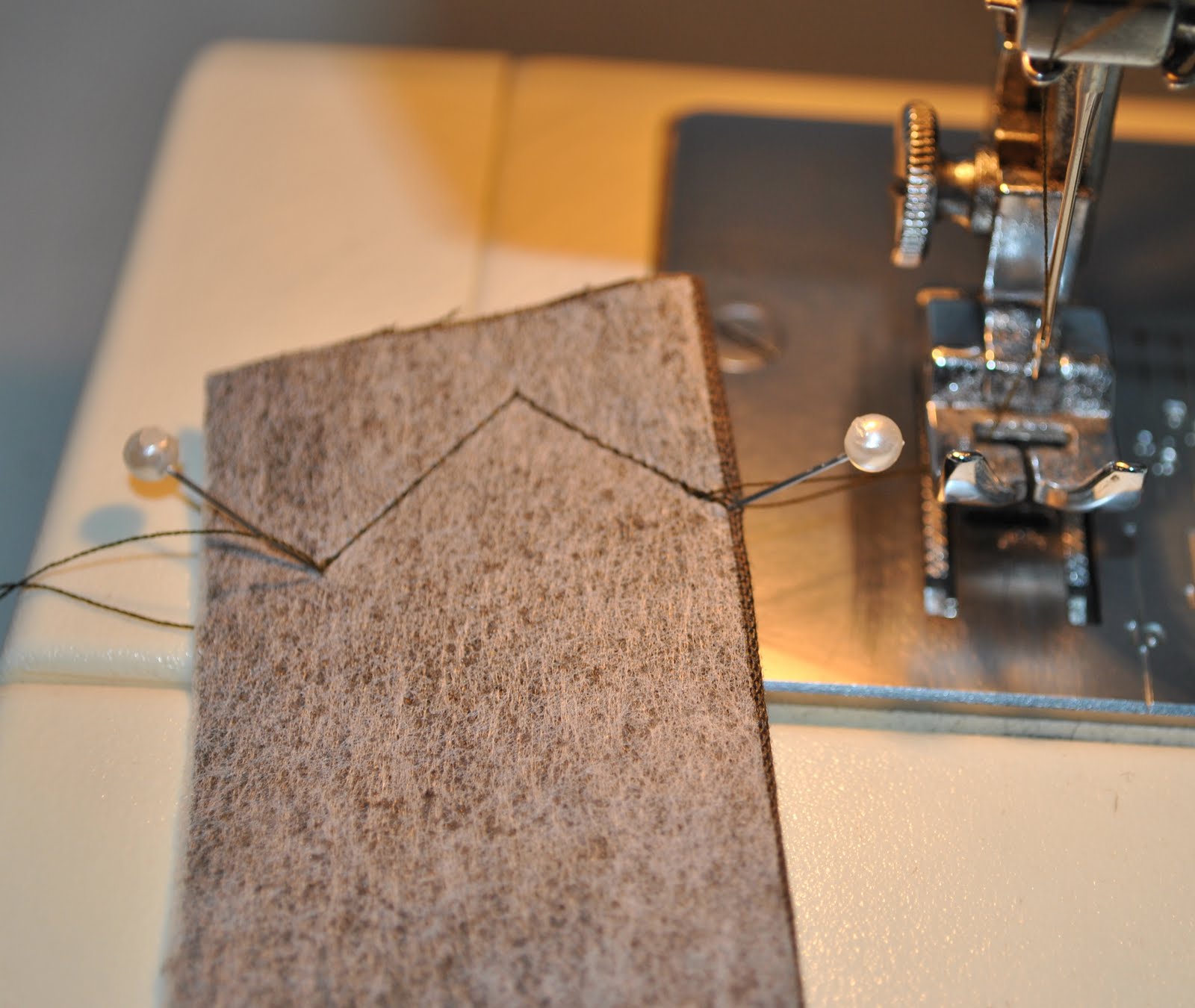 With the needle at its lowest point (to ensure that it has picked up the bobbin thread down below, and so that the stitch is completed) lift the presser foot and reorient the tab so you will be stitching down to the third pin position. Lower the presser foot and stitch down to the third pin, again ensuring that you are finishing as exactly as possible into the third pinhole. Secure the end by one or two careful backwards and forwards stitching.