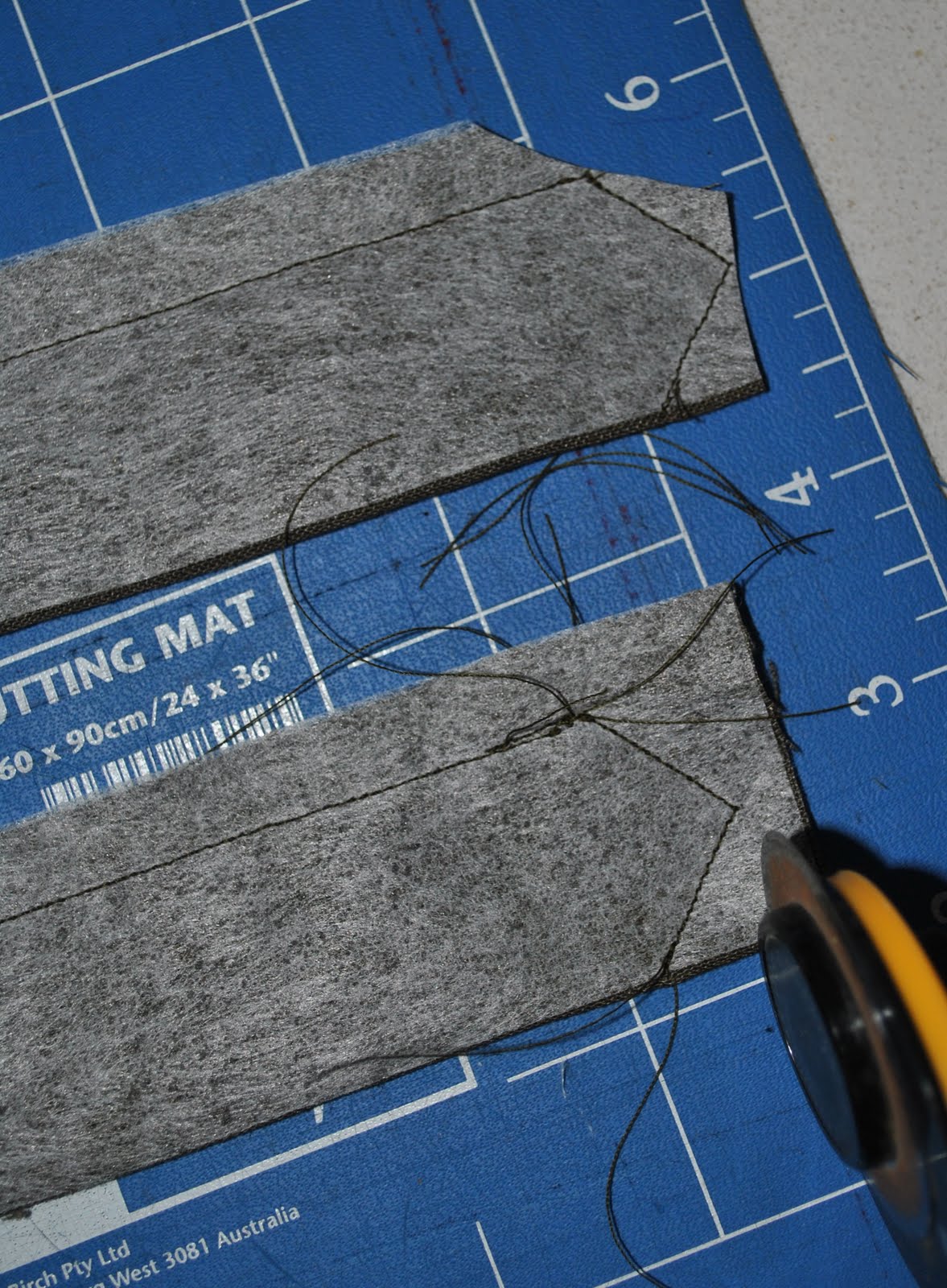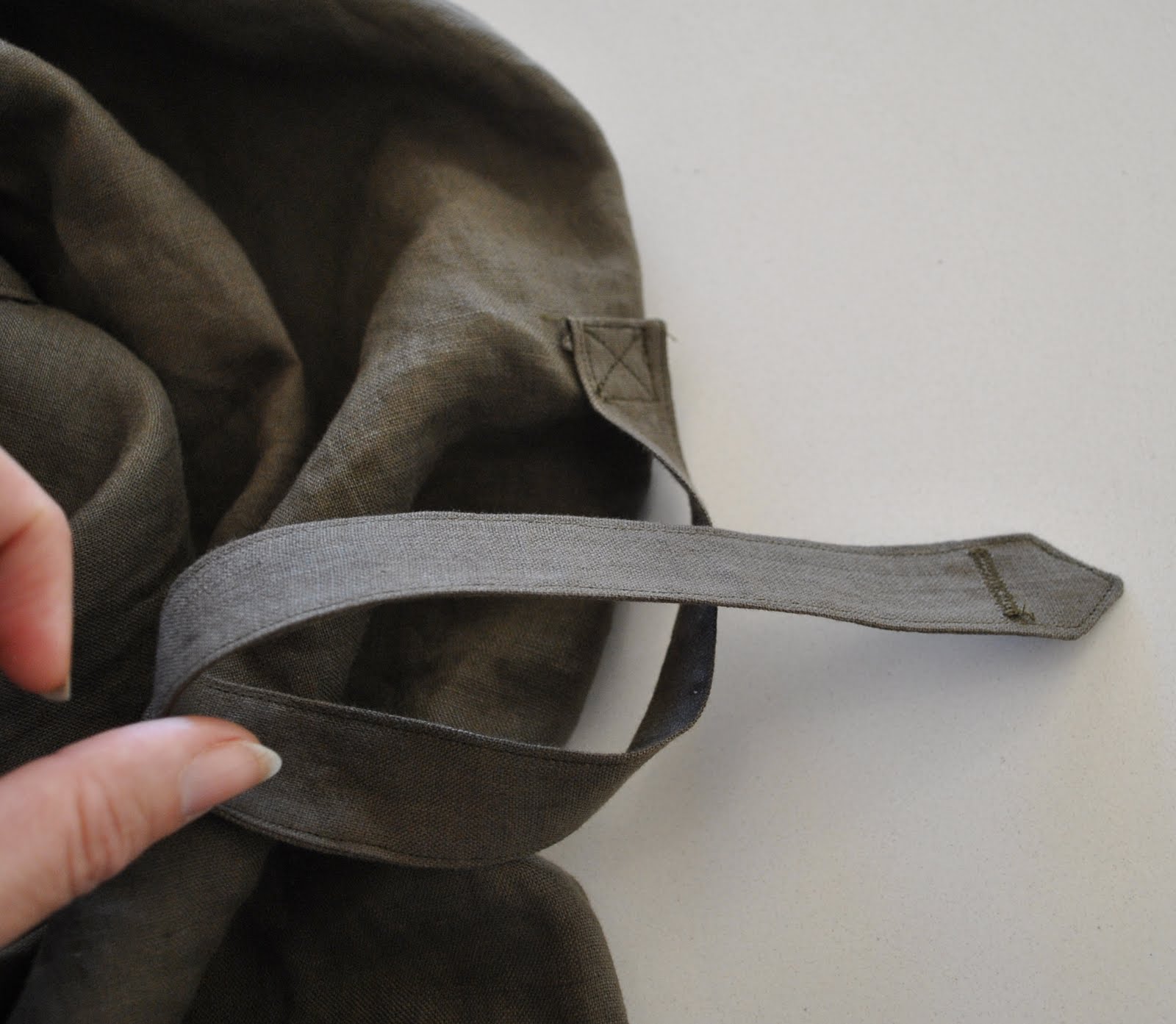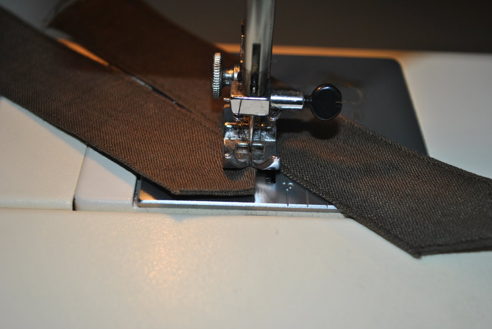 Press and topstitch the tabs. Sometimes when one is topstitching close to the edge of a tab and you turn a corner, your feed dogs may have trouble “catching” the tab and getting started on the next straight bit. This will be because you are stitching so close to the edge that there is no fabric underneath the presser foot, making contact with the feed dogs. In this case I find it handy to use the second tab and just slip it behind the tab you are topstitching; over the feed dogs. Just its presence there will allow your tab to slide smoothly along, no matter how close to the edge you are stitching.