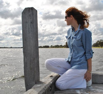 Version six; for Craig, white linen, white topstitching and buttons. Variations; one double welt breast pocket with looped button closure, no collar, curved lower hemline. Yup, I’ve borrowed this one a tonne too…!