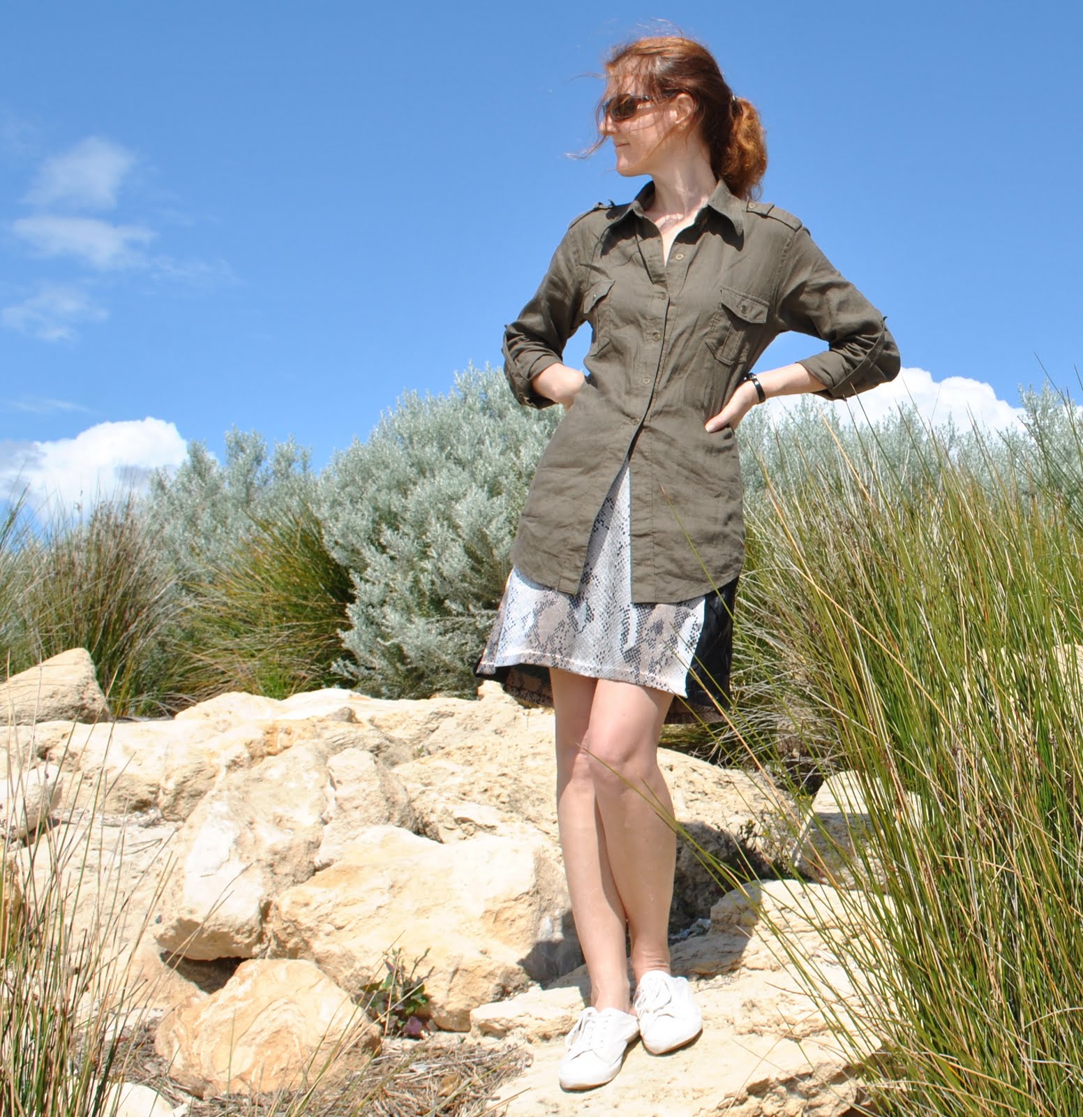 Today I’m trialling this old skirt. I’m not sure about it. It’s been sitting in my possible Sammie’s pile for a few weeks, since I realised I didn’t wear it at all during autumn or winter. I’m not sure if the python print is me, or not. When I made it I was particularly pleased with the black side panels which I randomly tuck-stitched to match the leather-y look of the print, and look like this below… And I’m always hesitant to toss out things that are still perfectly serviceable and don’t yet look just awful through too much wear; plus are potentially useful little summer things, like a skirt in a neutral but interesting print. What do you think?