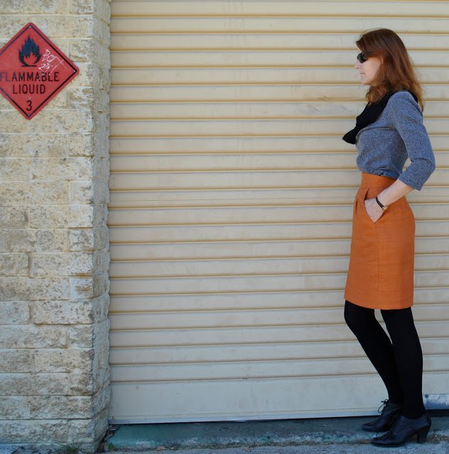 Gorgeous and love it styled with grey. I have more burnt orange in the stash. My piece is a silk line blend that looks a lot like your skirt fabric!