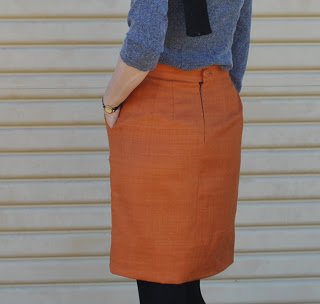 This skirt does have a very flattering shape on you. I love the fabric's texture and color. Nice job with those pockets!