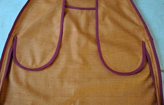 What a great color on you, and I absolutely love the contrasting binding and lining! 🙂 Cute pocket/pleat detail, too. I love roomy pockets!