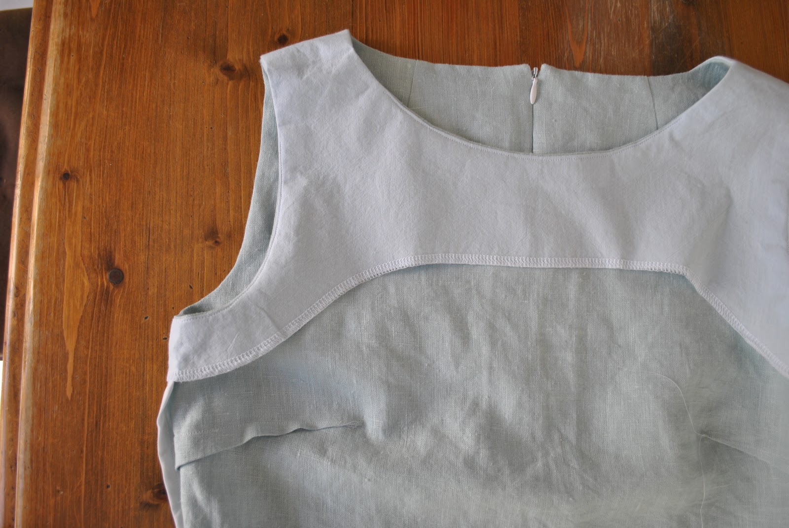 The dress is all made using leftover fabric scraps, and the wave-y welts were basically me experimenting and playing about which happily worked out just how I’d hoped.  The dress fabric is sea-foam green linen, the leftover bit from the shirt I made for my husband here.  I was sooo glad there was a little bit of leftover, since I had been such a good wife-y, making him a shirt and all.  I thought I deserved to keep this little bit for my own devious purposes, mwahaha.  And the pocket welts are of the leftover fabric from my burnt orange skirt, here.  The facings and pocket linings are of baby blue cotton, a biggish piece from my stash that is not a colour beloved by nor even suited to anyone in my family; but has still been incredibly useful.  It is getting eaten away slowly but surely for little things like this…