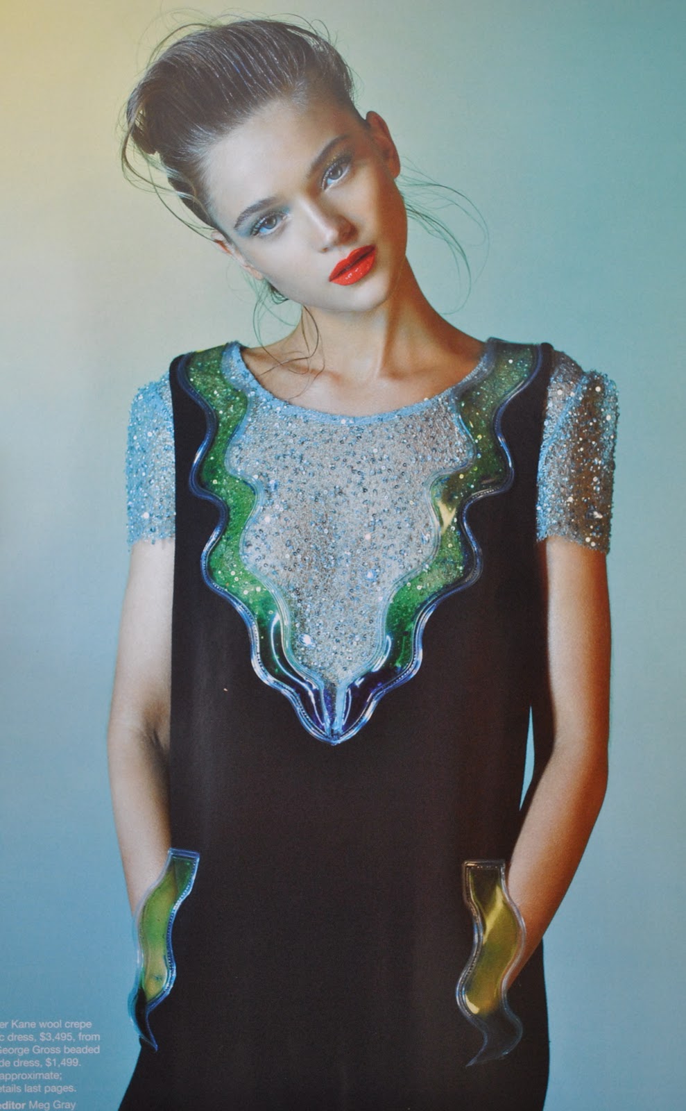 I’m very pleased with how those wave-y welts turned out.  I was directly inspired by this Christopher Kane dress (at right) with those wonderfully wave-y details.  The pocket welts and collar on this dress are heat-sealed plastic filled with gel of a satisfyingly toxic shade of nuclear-waste green.  Love it!  However since gel-filled plastic is currently beyond the capabilities of my little sewing room I just tried to reproduce the look in fabric.