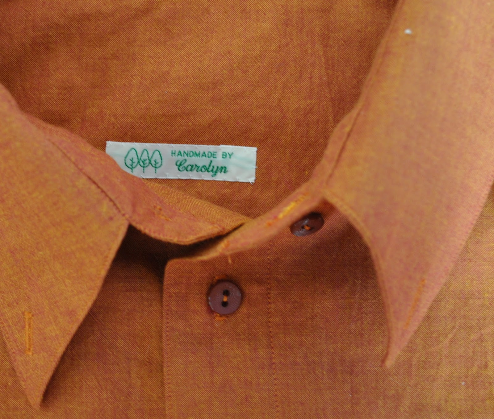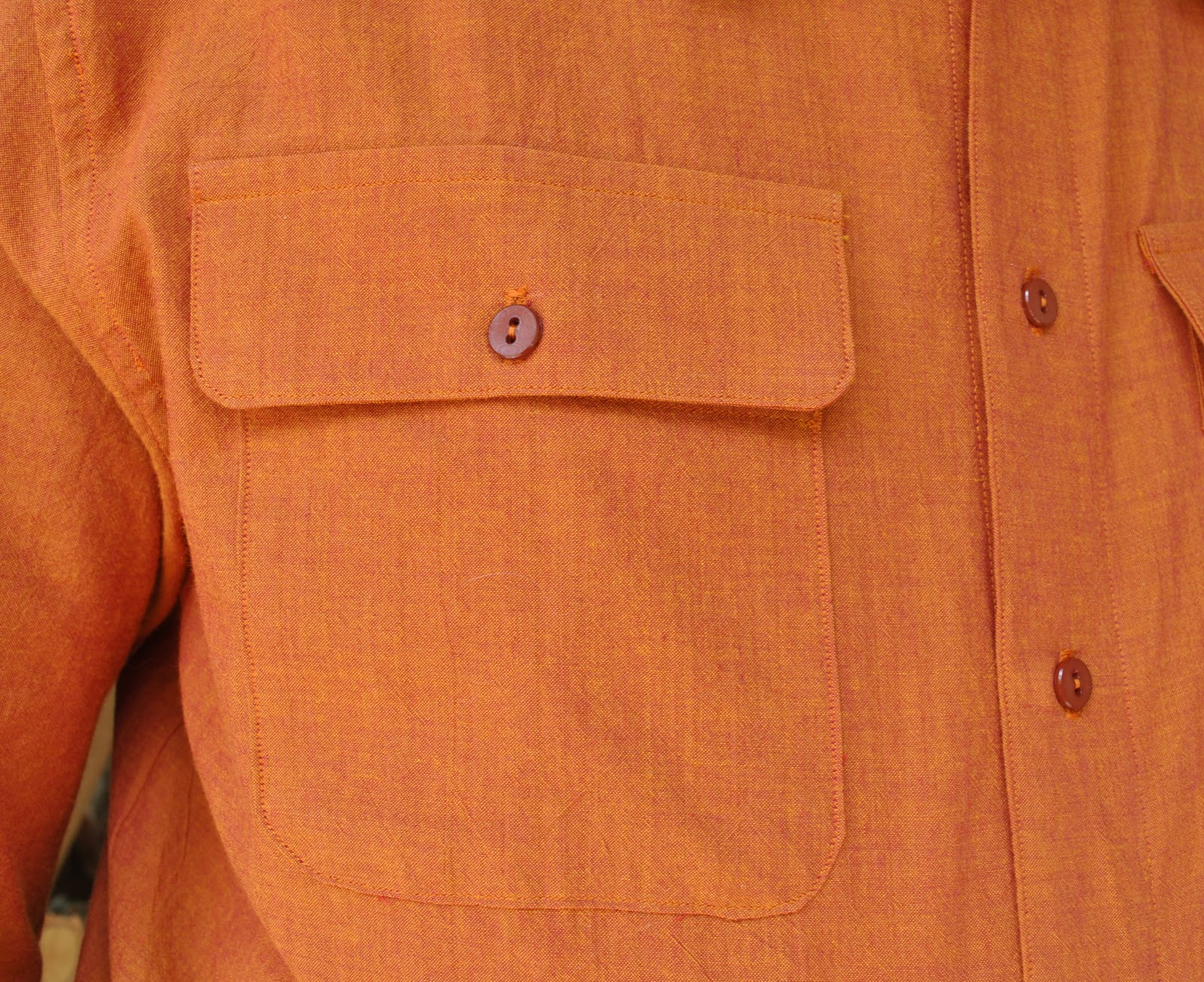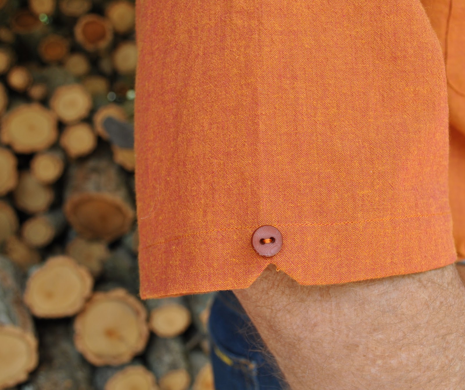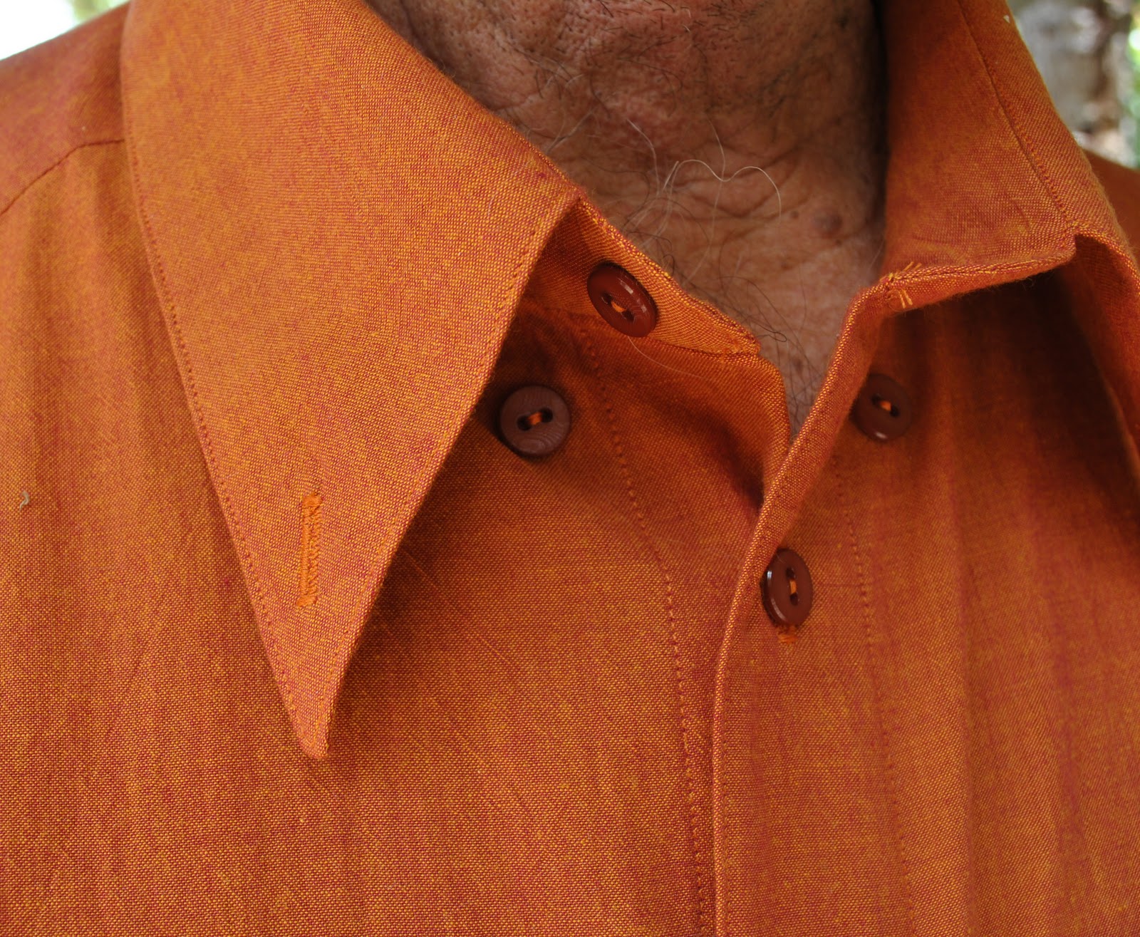 I debated about using either of the ruby-red or the curry-yellow colours for topstitching; I usually like some sort of contrasting colour, or at least something that stands out somehow, but I ended up going with a burnt orange that sorta matches the overall hue of the fabric. And with little matte chocolate brown buttons. And btw, those buttonholes on the collar are intentionally left uncut, since they are purely decorative and you are not supposed to do up those buttons on a casual shirt; I think they look neater that way.