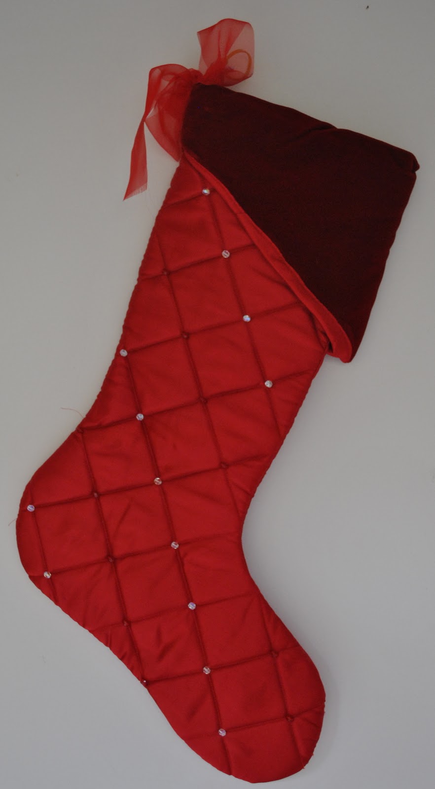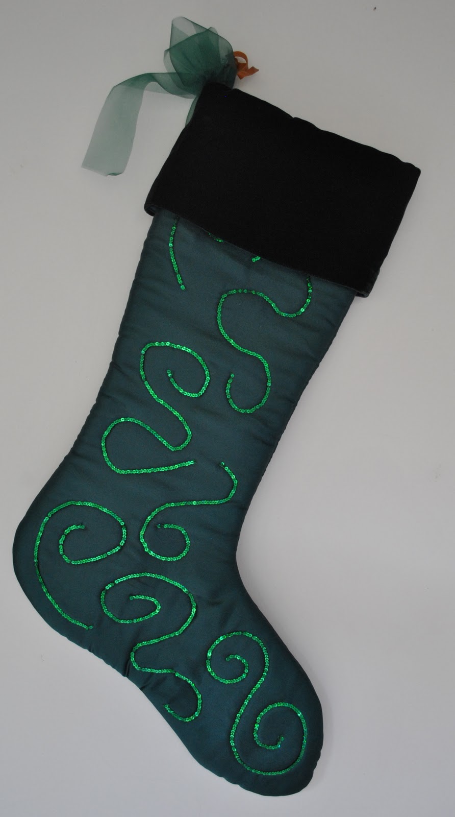 A few years ago I got really enthusiastic and made everyone in our family a glitzy Christmas stocking; big enough to be worn on a real adult foot, believe it or not… These are all of satin, each front and back double-layered and padded with old ironing board padding (yup, I keep stuff like that, just in case; sad, huh?), and with velvet cuffs, all decorated in an individual way. They each have a cotton loop to hang them up, even though they never ever actually get hung up since I baulk at having nails hammered into our beautiful jarrah mantlepiece… (that’s an over-my-dead-body sort of a thing) They usually lie flat around the bottom of the Christmas tree.
