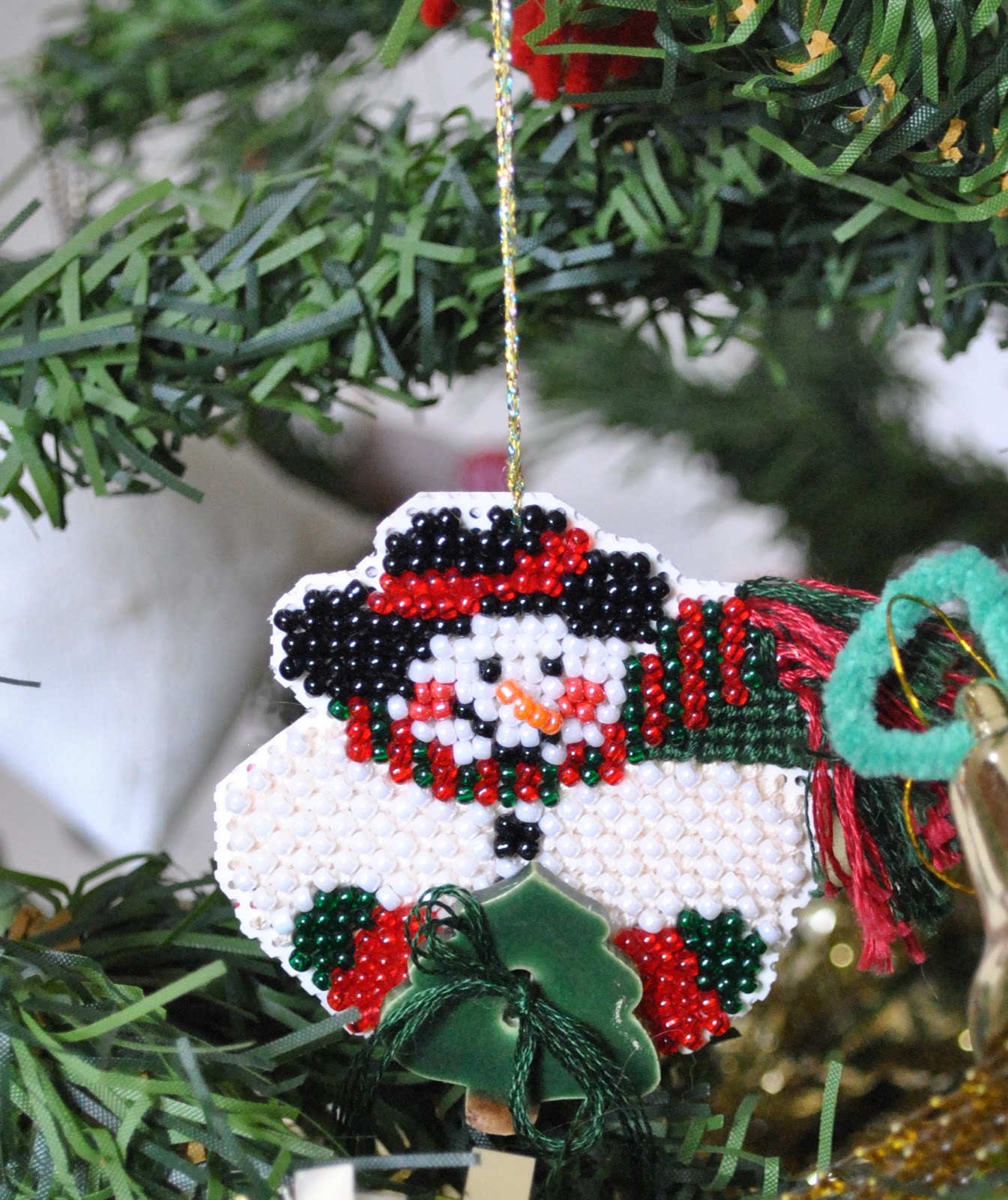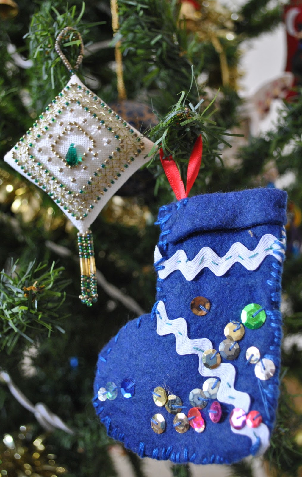 … beaded snowman and white beaded and embroidered pillow both from kits (by me); the blue sequinned and embroidered stocking by a pre-school Cassie