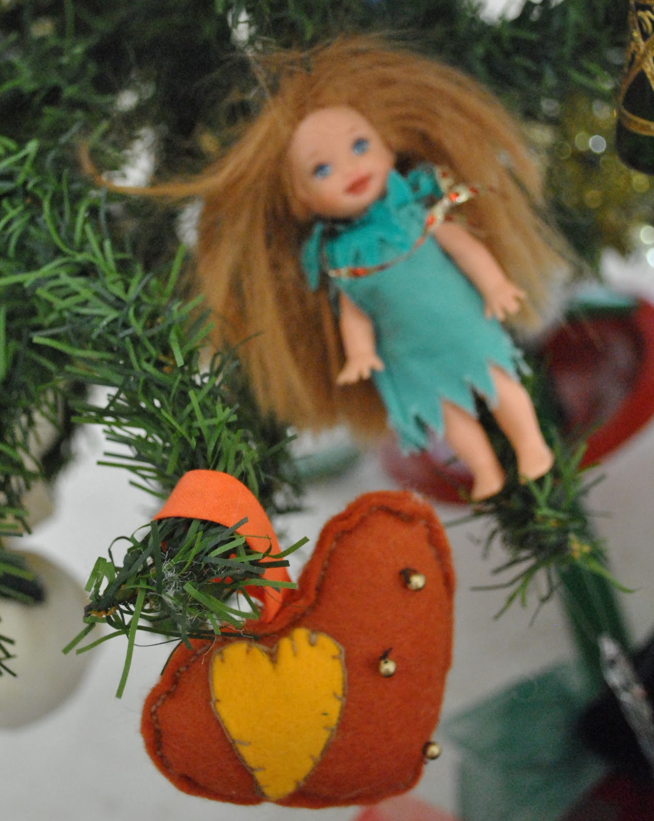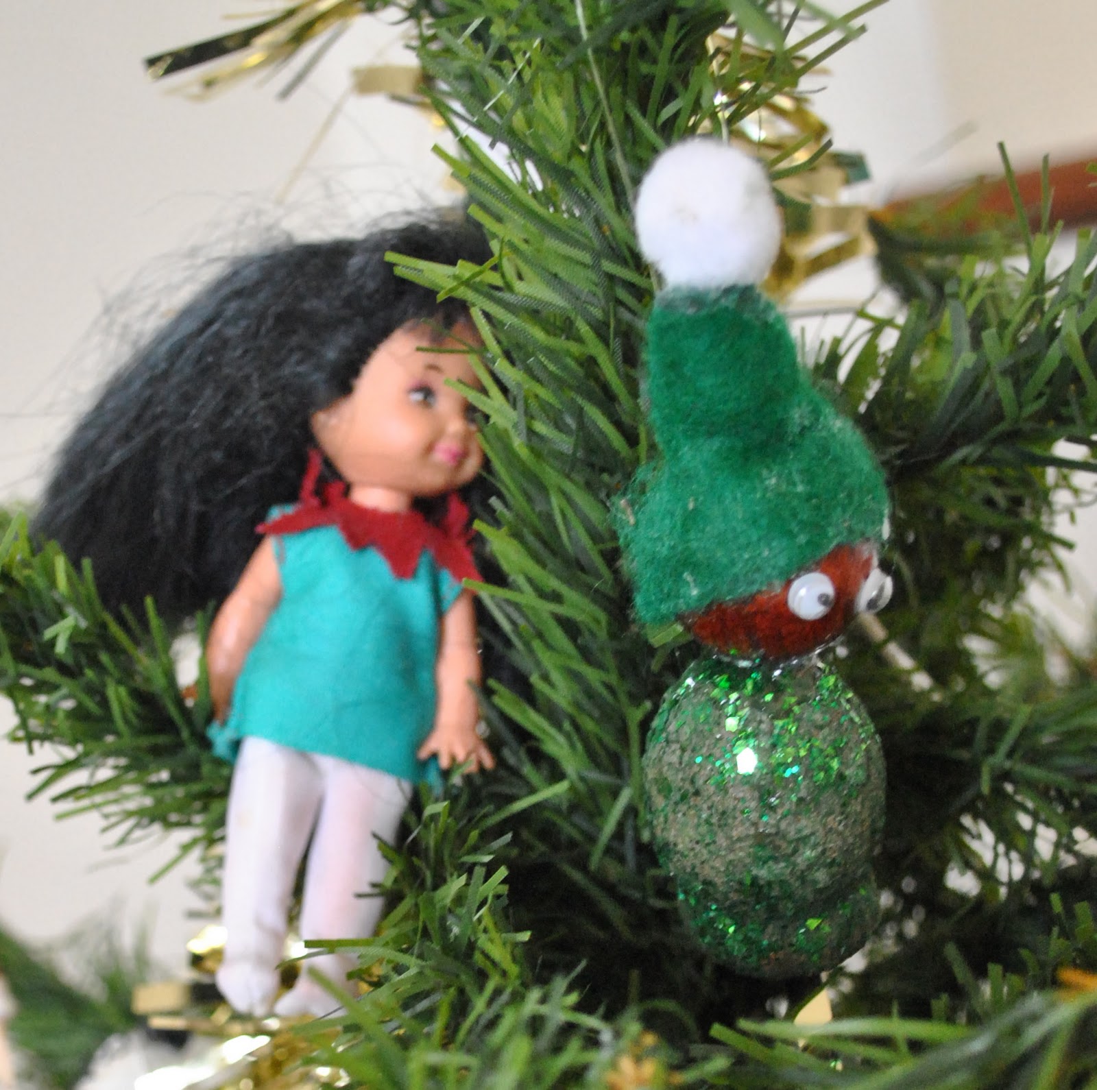 one year, Cassie and I ceremoniously transformed her Kelly dolls into elves and pixies…   Tim made the sparkly gumnut elf with googly eyes…