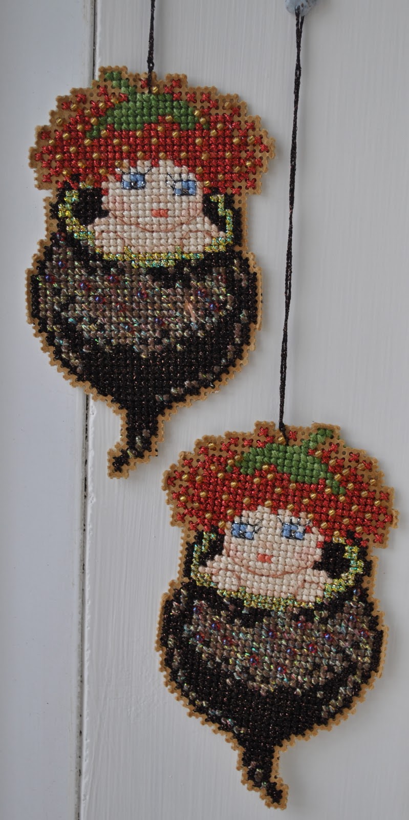 According to Aussie tradition, these gumnut babies have to be hung somewhere so they can “see” a gum tree. (embroidered and beaded on cardboard by me)