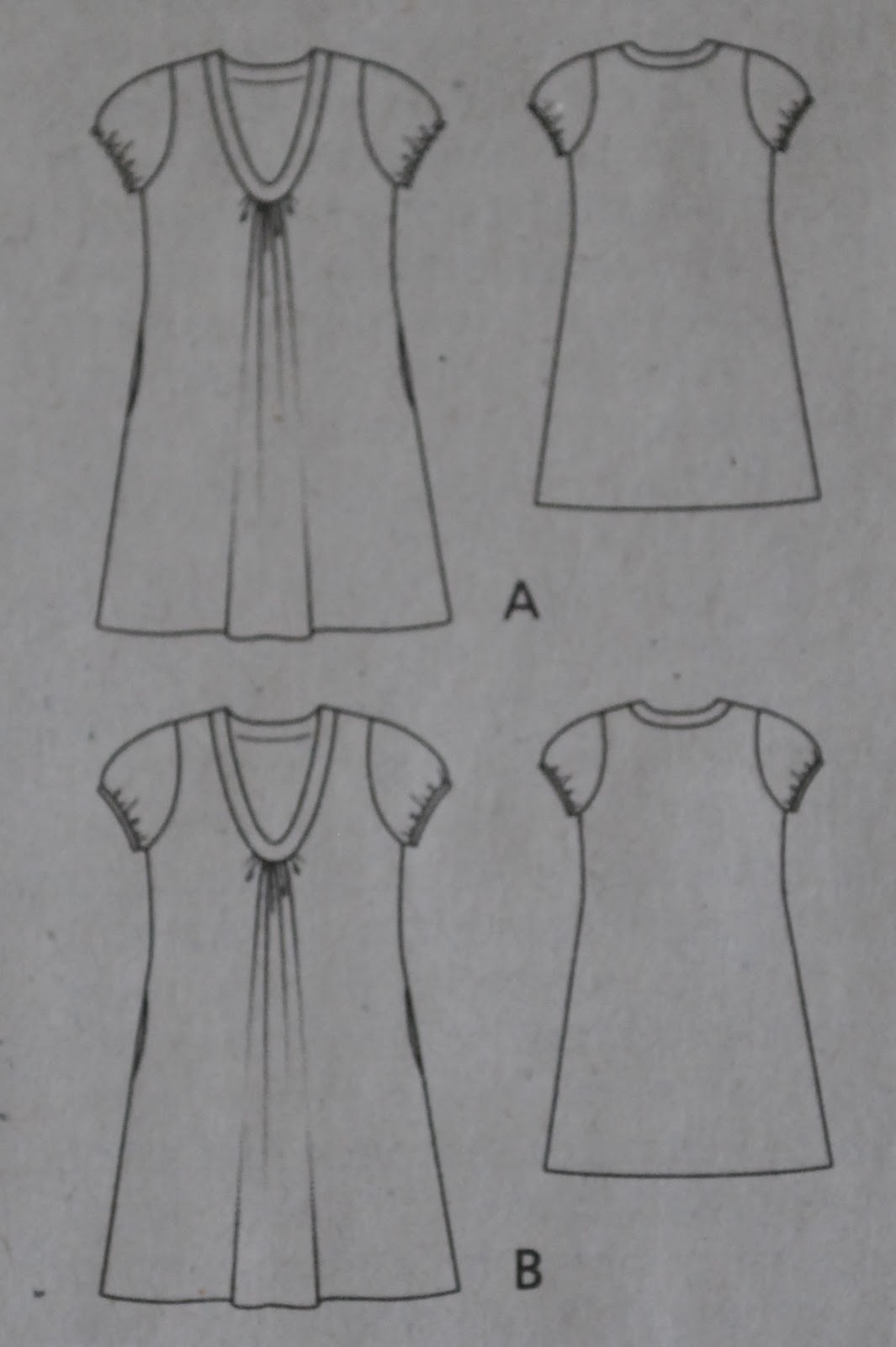 Flared bias-cut dress with an oval neckline which according to the magazine description “accents an alluring décolleté “ (hehehe) Small gathered cap sleeves, inseam side pockets, no closure necessary.