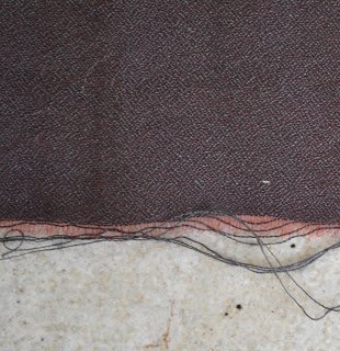 The fabric is shot rayon; with a red warp and a dark blue/grey weft, giving it an overall browny-purple hue. Craig took this last candid photo which illustrates quite well how the fabric takes on different colours in the light (a hallmark of shot fabrics)