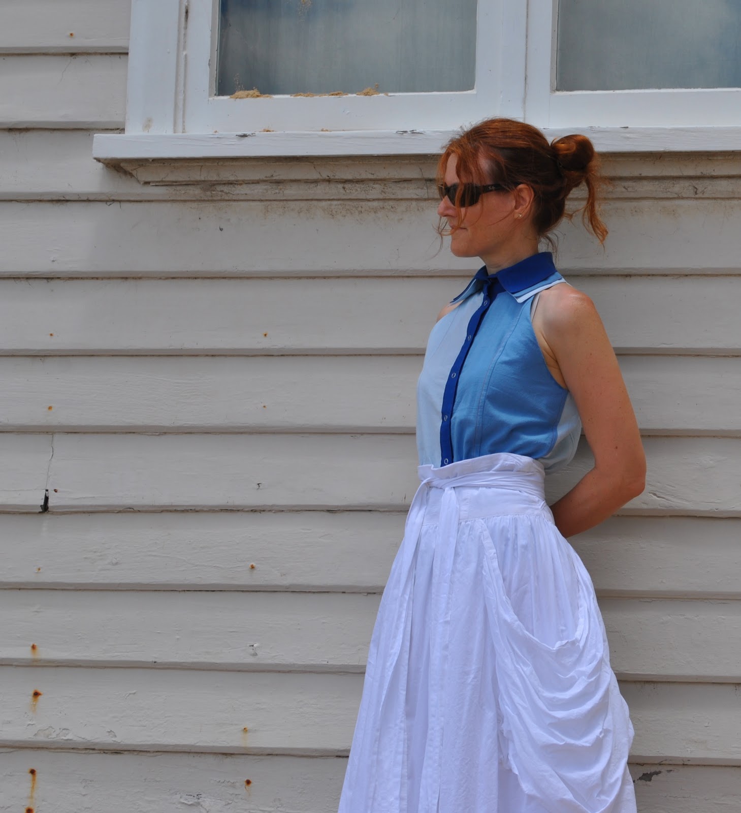 Simply beautiful. I love the skirt in this light cotton? and the huge pockets and the shirt is just wonderful, the three colors of blue in the shirt. It's beautiful inside and out.