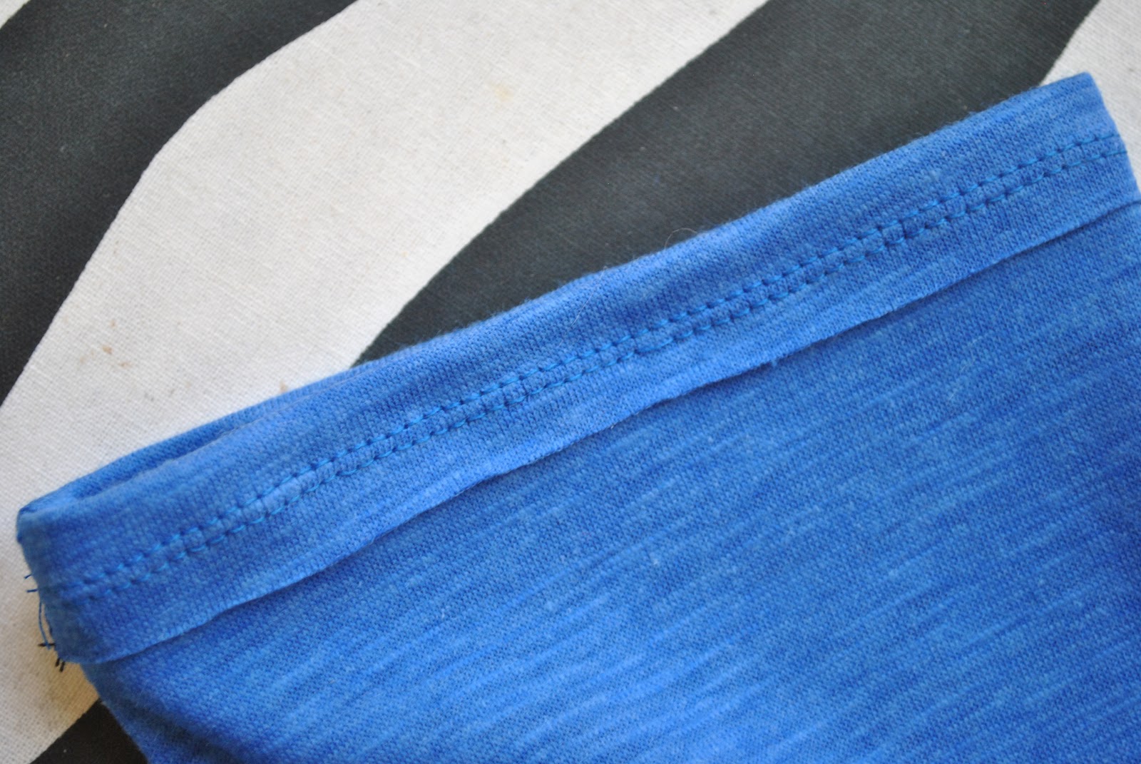 (Oh, for the neckline, you have to measure the finished length of the edge of your neckline, and cut out a 2.5cm width strip (with the length going the stretchy way, natch) the same length, plus 2cm for seaming. I didn’t take any photos of the neckline finishing, sorry…. maybe next time 🙂 but it’s essentially the same process from here on)