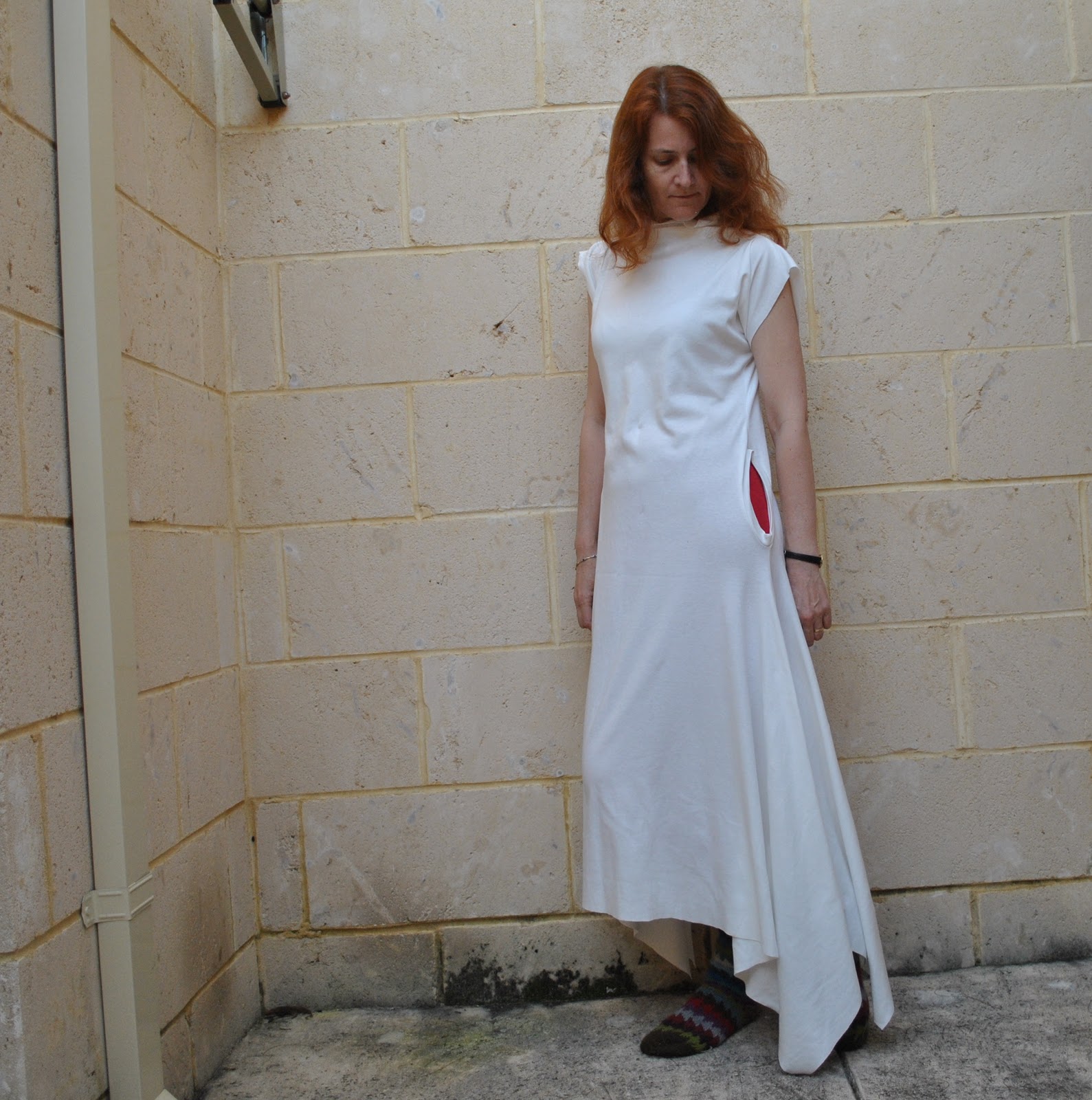 Remember this dress?  I put it on recently and my husband announced kindly but firmly that he thought it was weird.  His words sounded its death knell.  I have put this on once or twice since I made it and each time felt sorta… well yes, now you mention it, weird is exactly the right word.  I finally acknowledged that the fabric was wrong for the design, too thick and heavy and with too much body to drape gracefully enough.