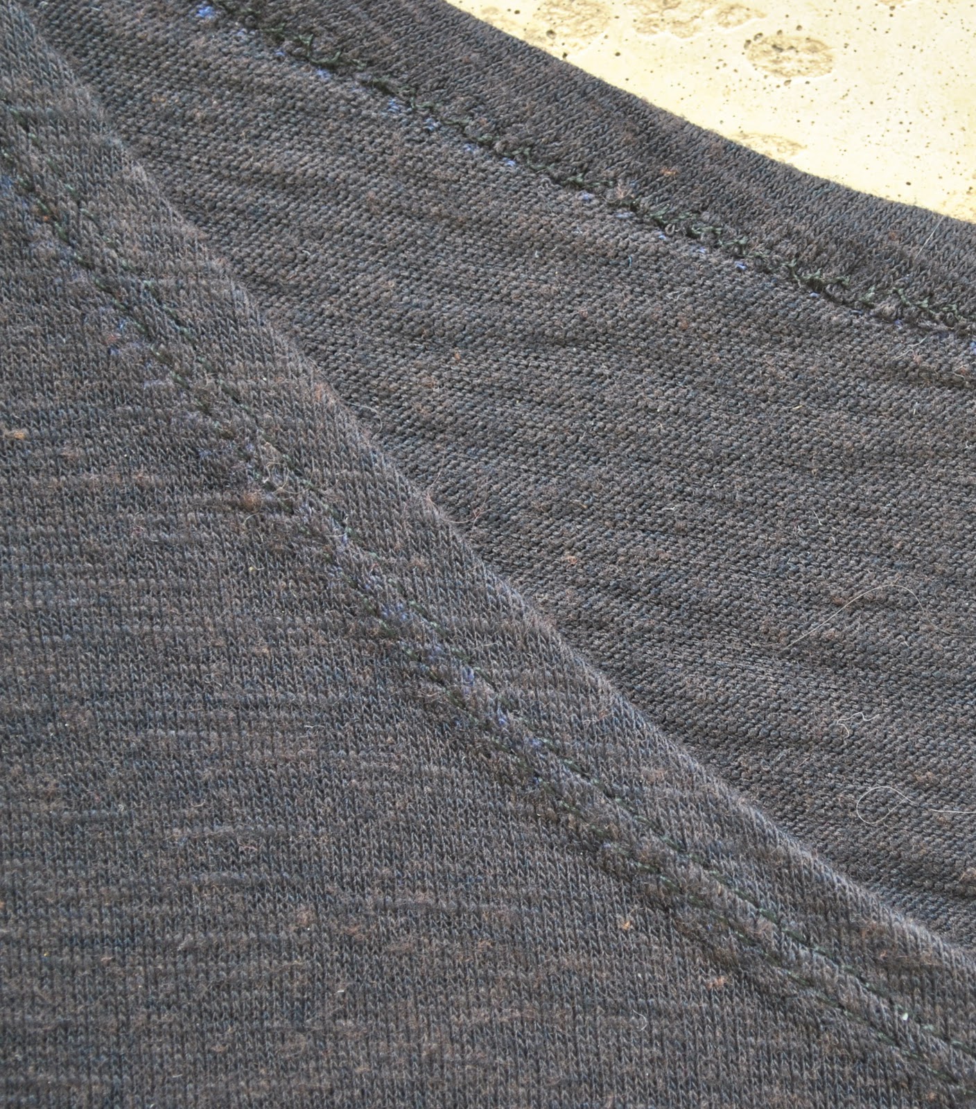 I finished the neckline and armholes by simple turning under the raw edge and topstitching with a twin needle. This is a great and very easy finish for knits, not as polished a finish as the banded edge, but the perfect choice for something like this top where bands would have visually been too much detail on a top that is already chocka with textural detail. Those little shark fins at the hips are as much detail as the eye can take in my opinion, and the plainer the rest of the garment the better.