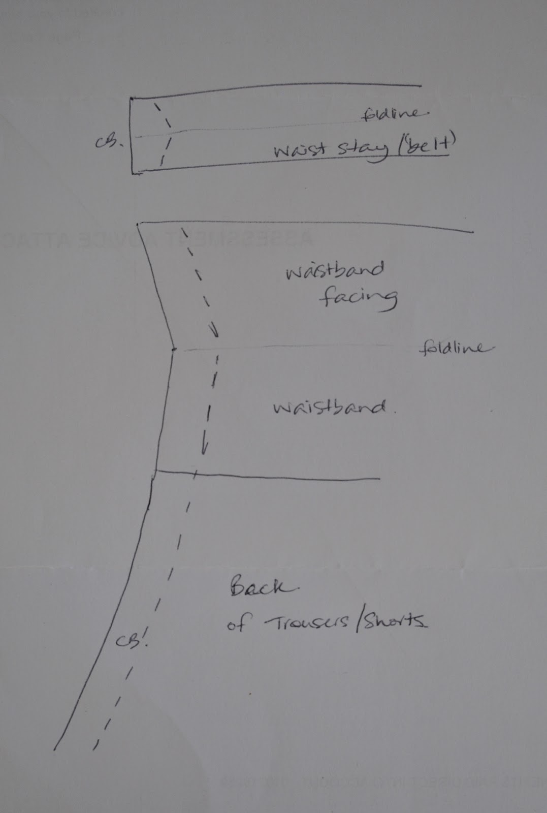 Do the final waistband fitting and stitch up the waistband centre back. Once this is done, measure the belt to fit, and sew the two together at the centre back seam. If you are like me and always stitch a slanted centre back seam to fit a sway back, then you will have to stitch the facings and the belt pieces together on the diagonal to match. Below is a very rough and somewhat exaggerated diagram to illustrate what I mean (obviously, the angles should all match), that centre back seam is sewn in a symmetrical arrowhead with the point at the central foldline. I left out the waistband facing and belt seam allowances for ease of drawing, but they should be sewn with their own little opposing diagonals as well…. This is necessary to get them to sit nice and flat when they are all folded and tucked in place. Once stitched together at the centre back, fold the centre back of the belt in half lengthwise and press, and stitch the remainder into place on the waistband facing.