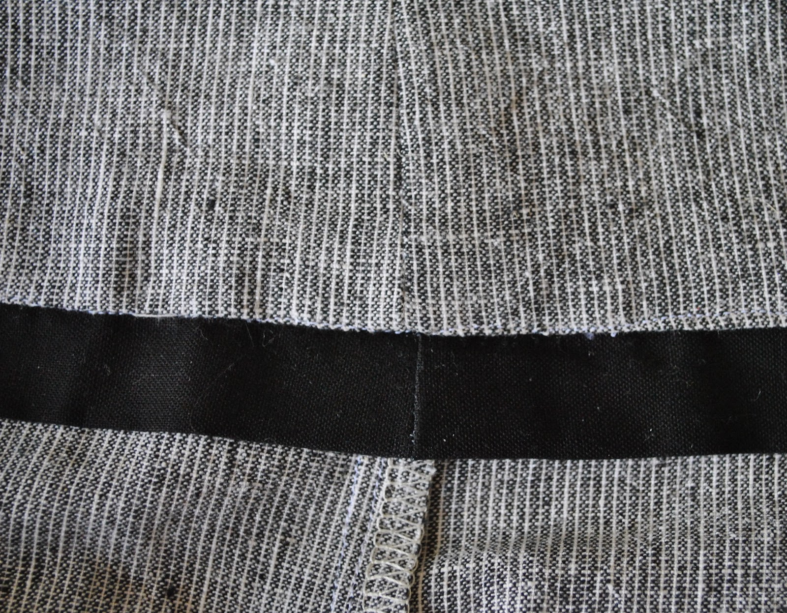 Cut two long pieces of sturdy woven fabric on the grain lengthwise to be the hidden “belt” or waist stay (I’m just going to go with “belt” from now on, OK?) I used some rather nasty, densely woven, very tough black quilting cotton that I bought from Spotlight yonks ago, unusable for any real garment but that has been wonderful for all sorts of pocket lining, HongKong seaming, waistband facing, and a whole host of other hidden purposes. I cut my two pieces to be plenty long enough to go around half my waist, plus extra, and the width should be double your desired finished belt width plus double seam allowances.