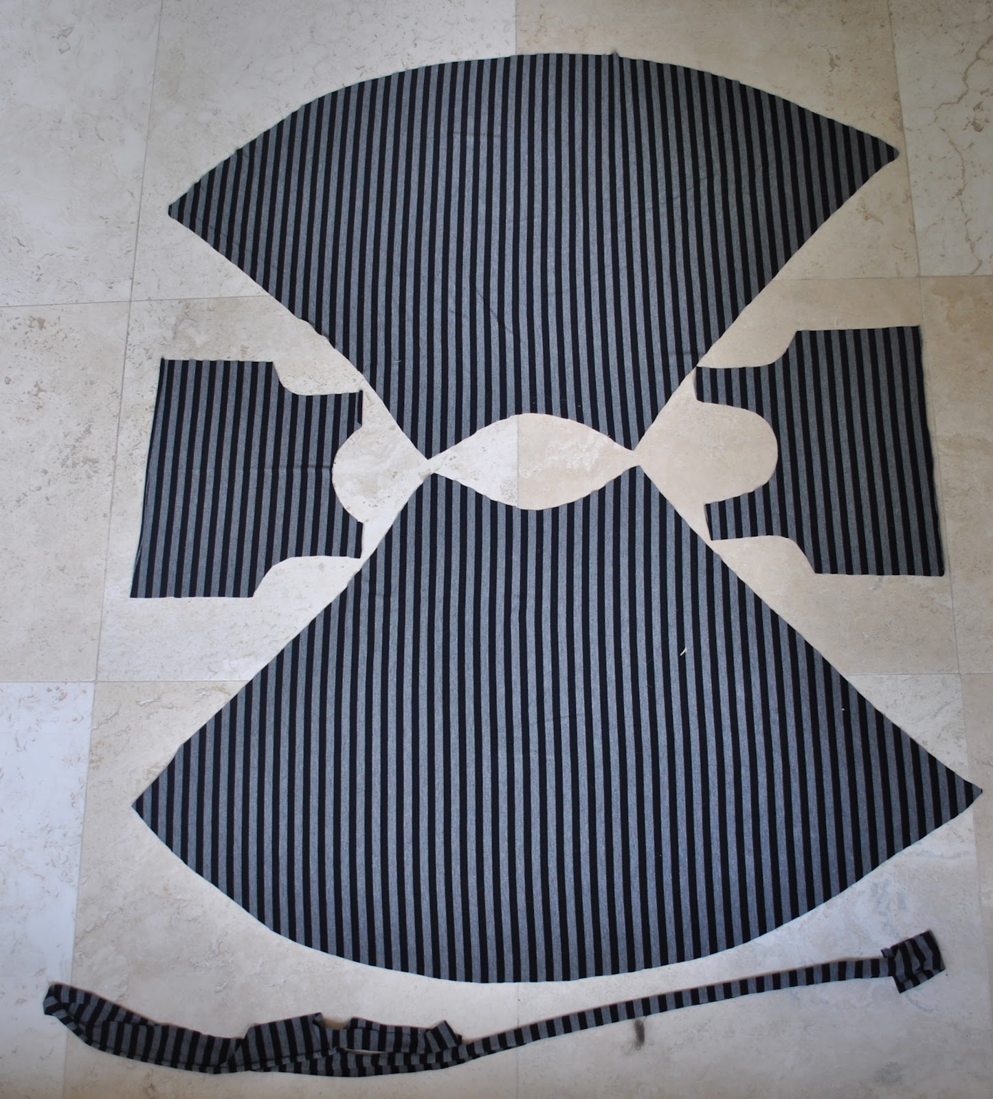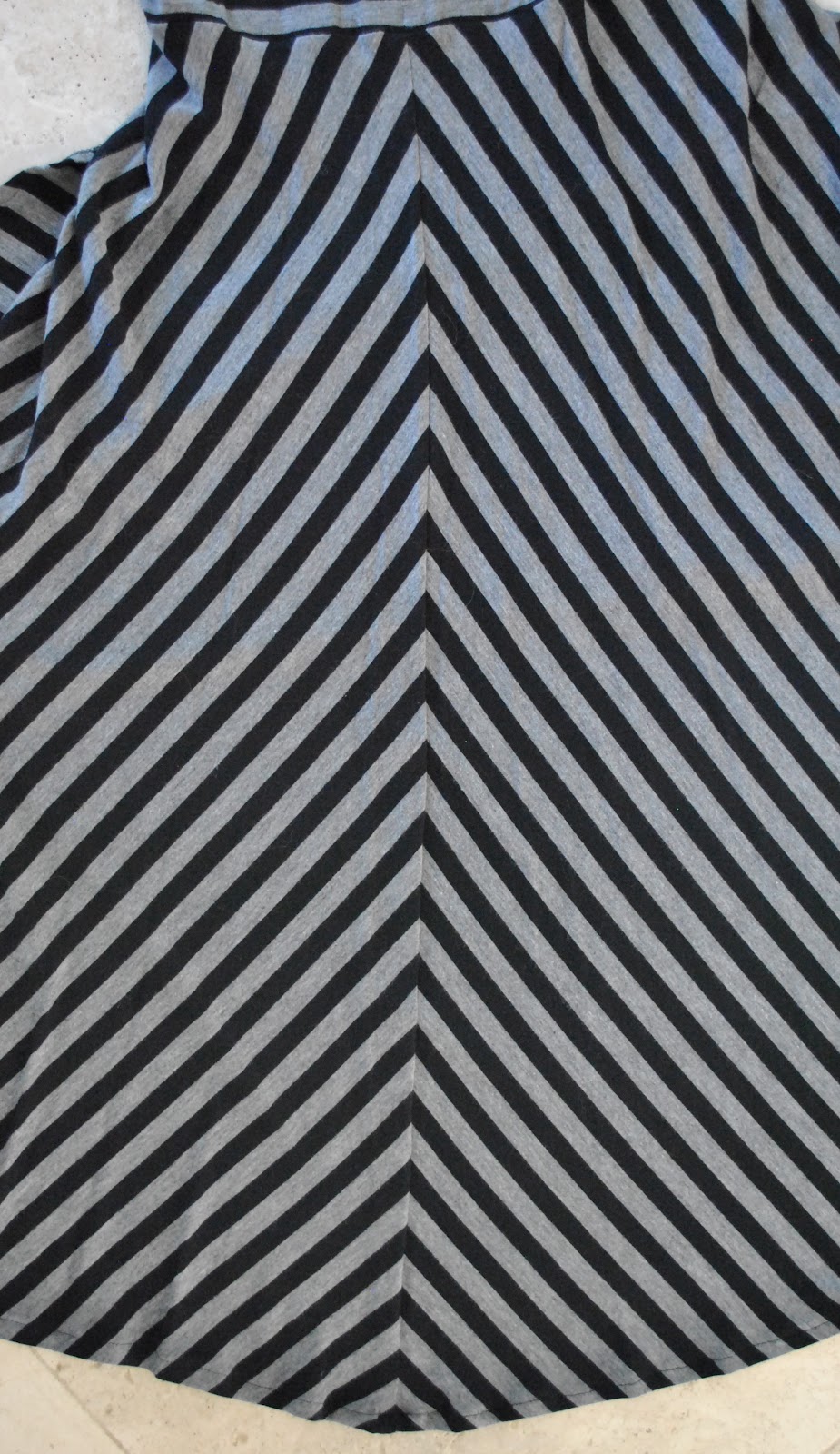 I used a cotton knit jersey with a charcoal and black stripe from Fabulous Fabrics, and drafted my own pattern with the help of a tank top. The skirt is just a slightly shaped to-the-waist and then flared A-line design. I bought 2m of 150cm width fabric, but found that 1.2m was plenty to cut out this dress shape using the layout pictured below.