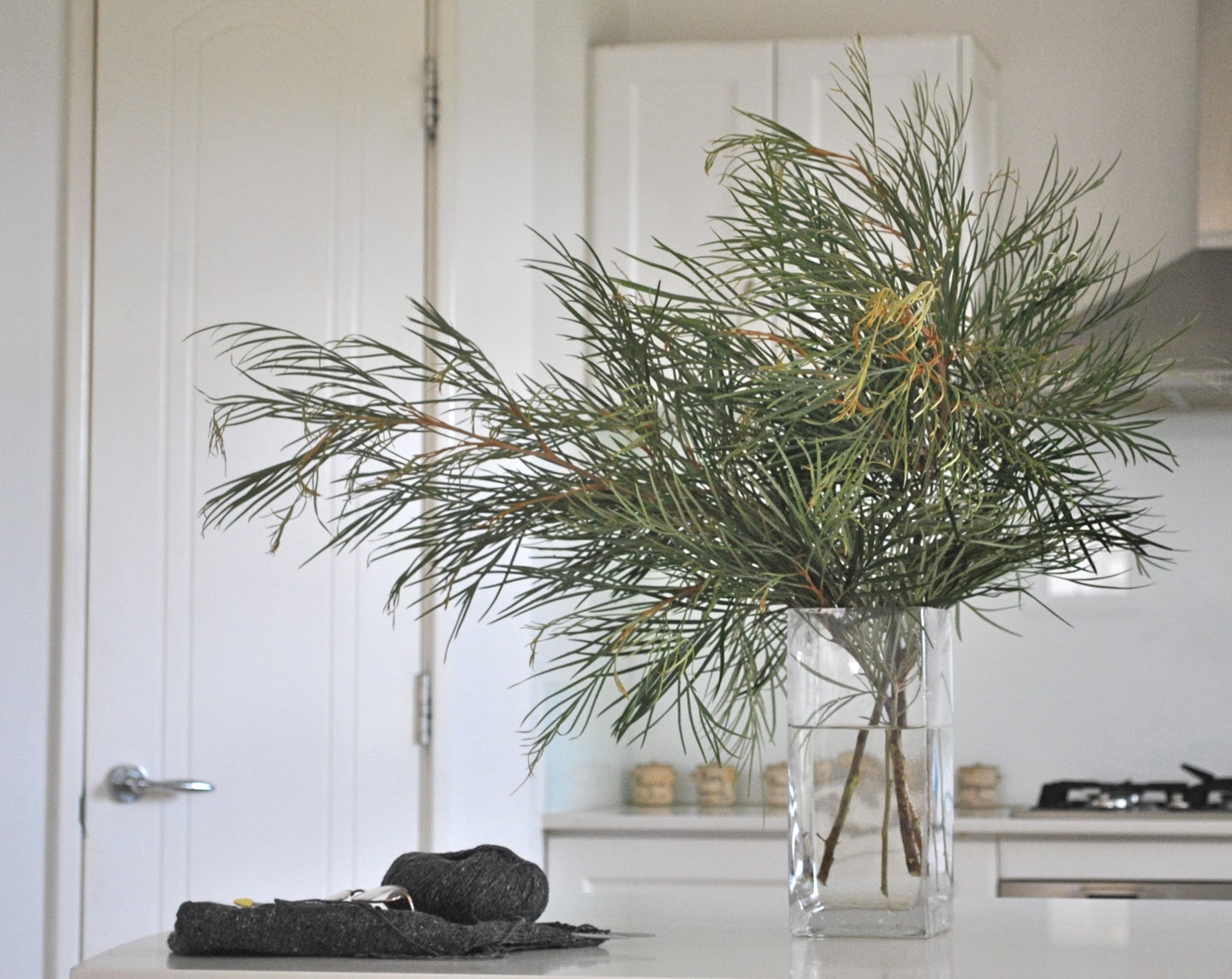 Love the vegetation in the vase 🙂 Grevilleas are so pretty.