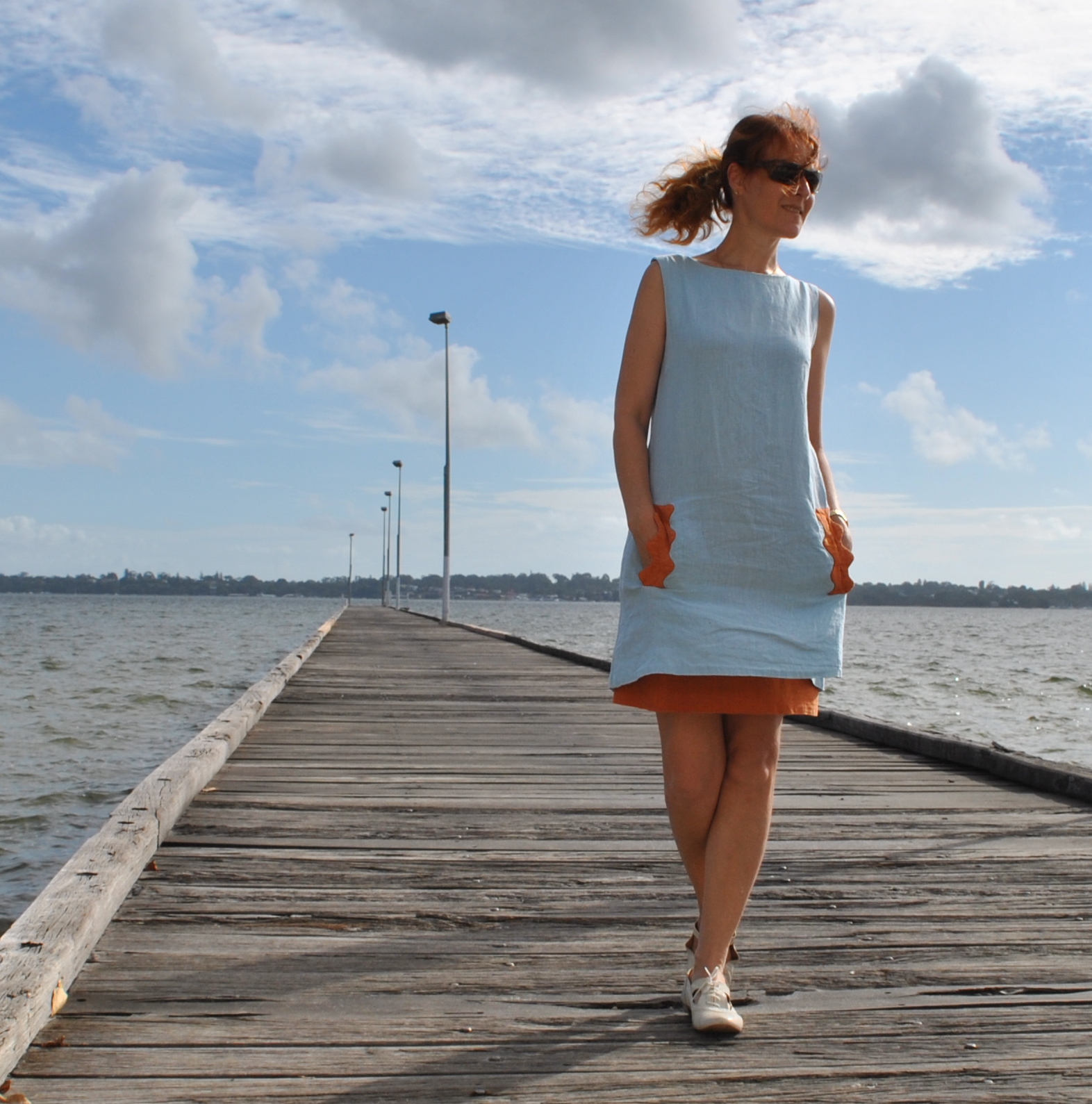 This dress is one of my favourites! I love the zippy orange against the pale blue. And I know it must be comfortable in warm weather.